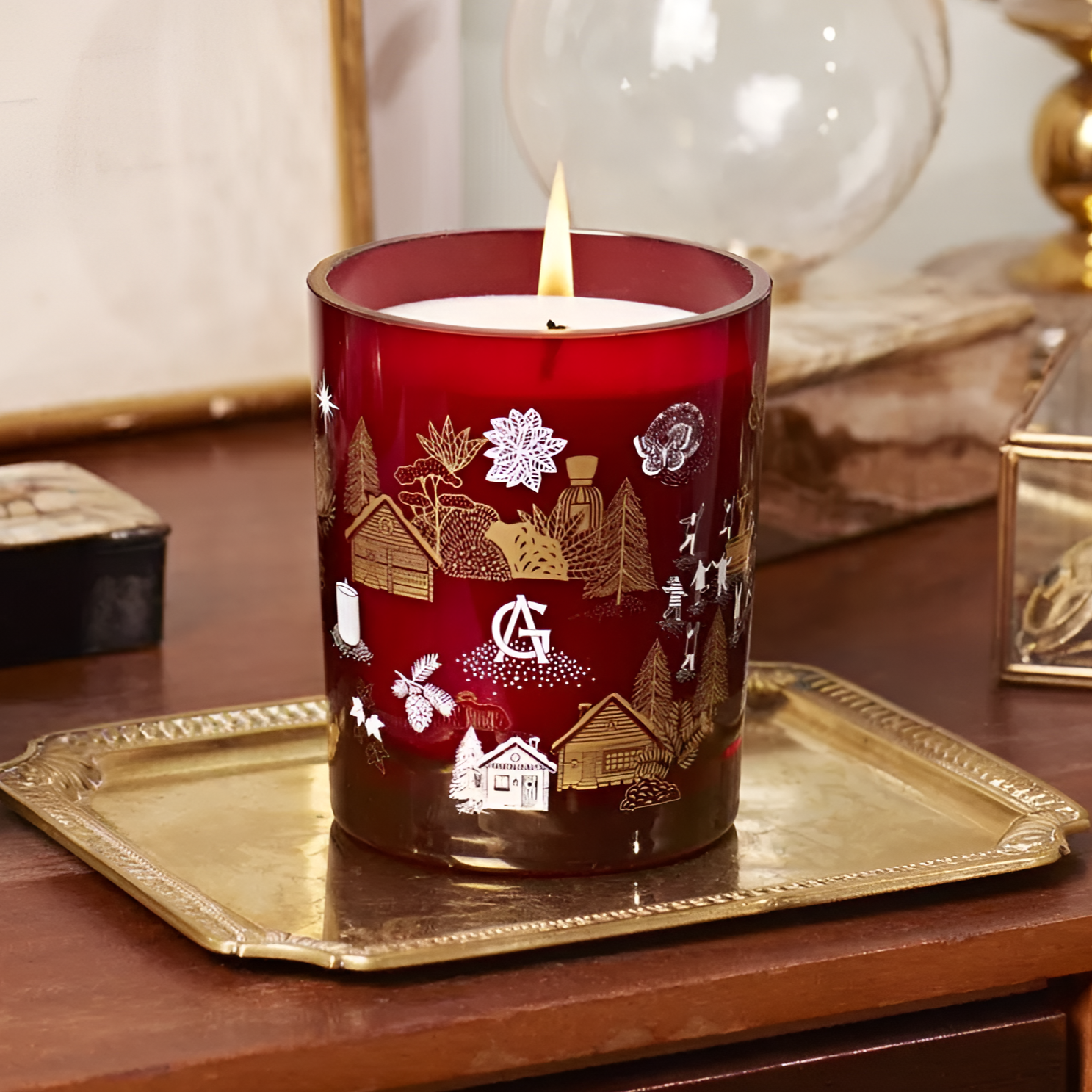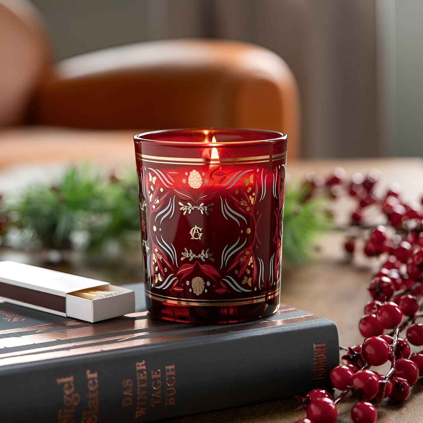 أشعل سحر العطلات مع شمعة Goutal Une Foret D'Or ذات الرائحة الحمراء.