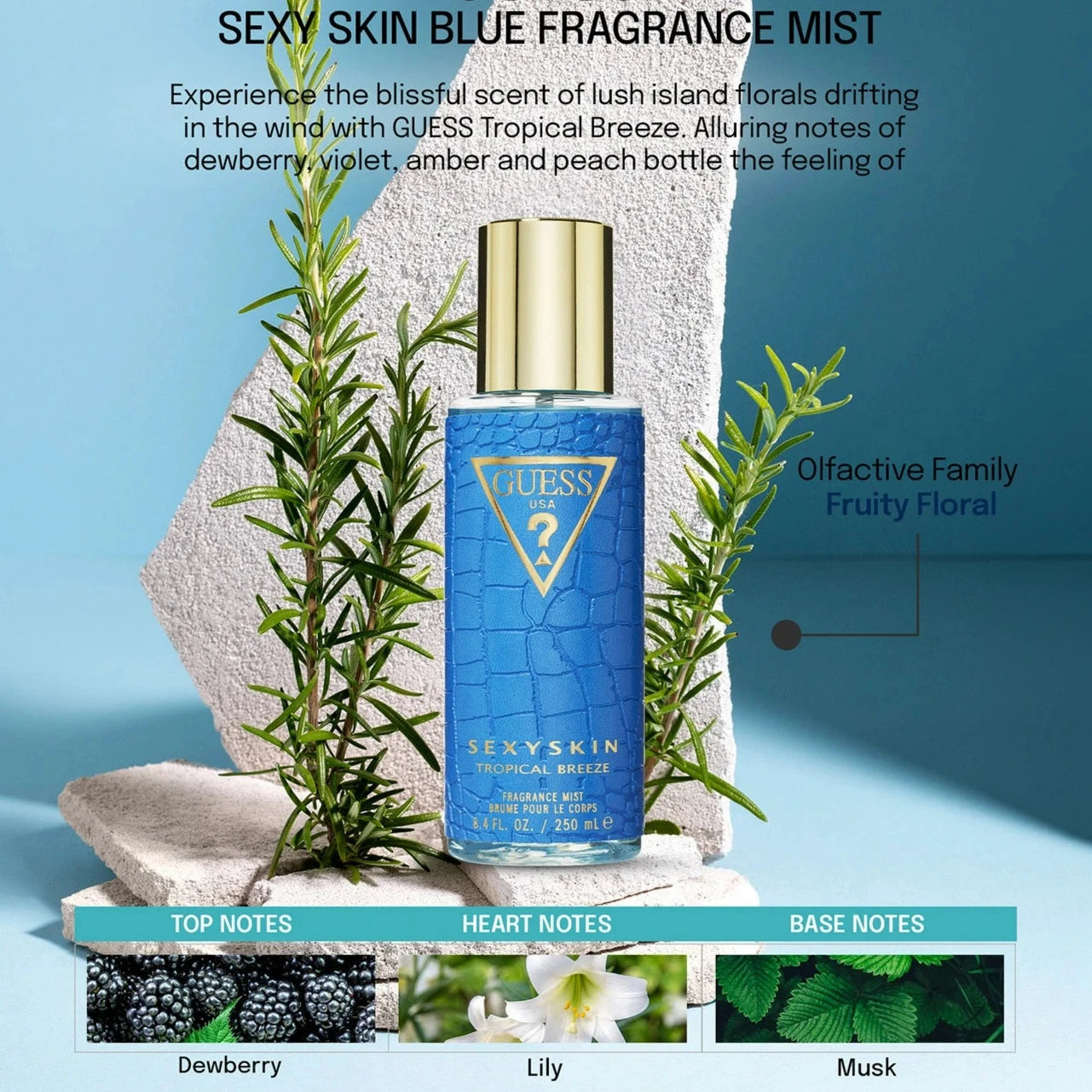 يتمتع عطر الجسم Guess Sexy Skin Tropical Breeze برائحة تشبه الهروب الزهري الفاكهي، مع أزهار الجزيرة الخصبة والأناناس الحلو ونوتات العنبر الدافئة.