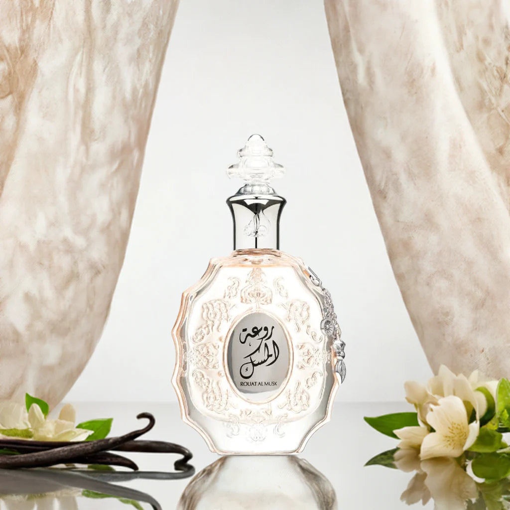 Rouat Al Musk by Lattafa is a soft amber floral fragrance with notes of mandarin, orange blossom, jasmine, and vanilla.