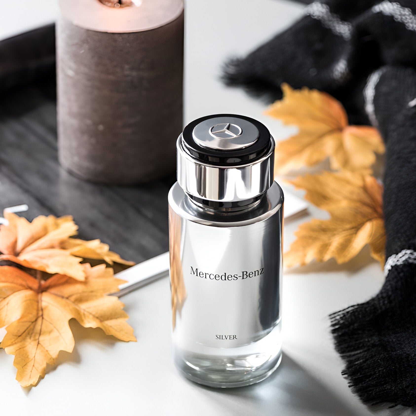 عطر مرسيدس بنز سيلفر أو دي تواليت بمزيج من الروائح العطرية والترابية والمسكية، مع نفحات الفلفل الحار ونفحات عشبية من نجيل الهند. مستوحى من بلو دو شانيل.