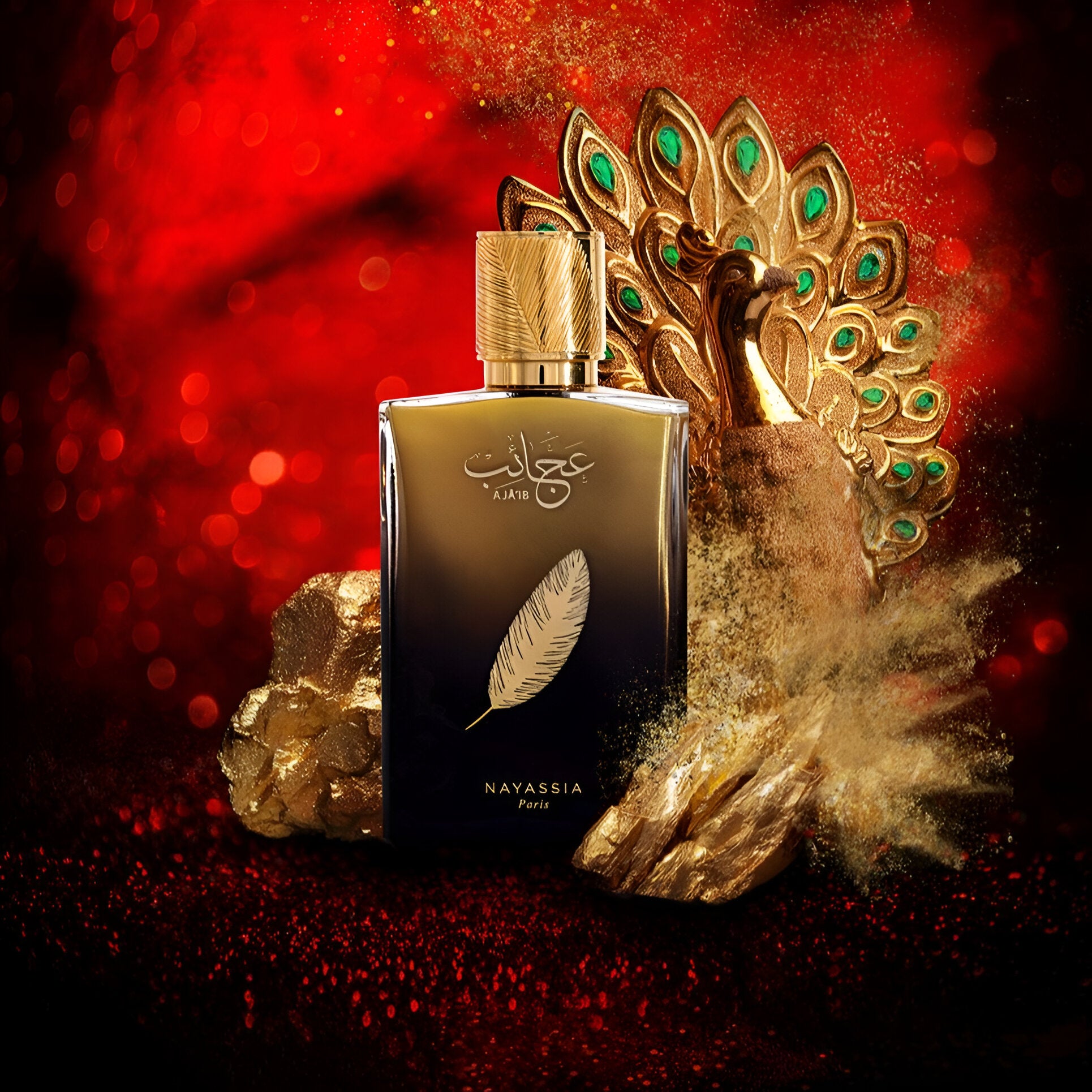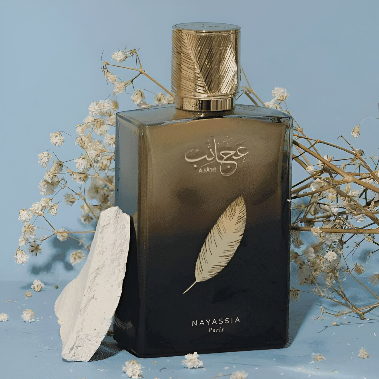 Nayassia Aja'Ib EDP هو عطر خشبي عطري مناسب للجنسين يجسد جوهر جمال العالم والسحر الغامض للشرق في كل رشة.