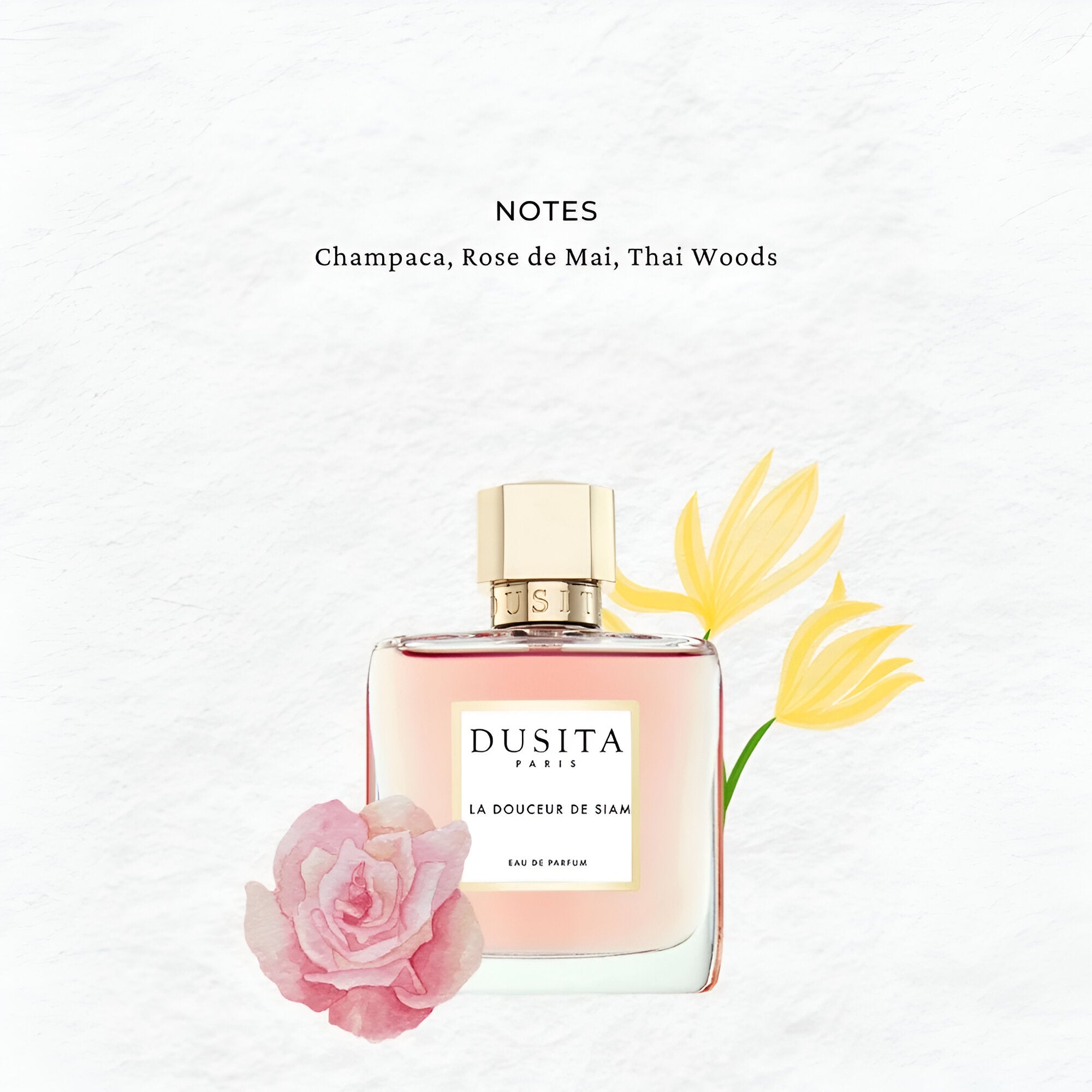 لا دوسور دي سيام: عطر غريب يمزج بين اليلانغ والفرانجيباني، يستحضر حديقة التوابل التايلاندية في الشفق مع روائح طبيعية مثيرة للعواطف.