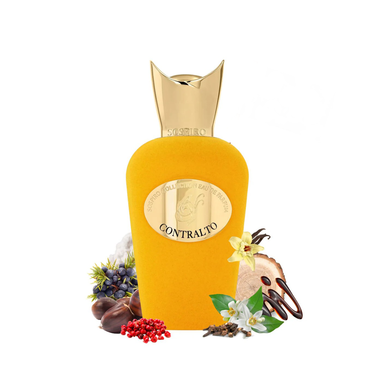 Sospiro Contralto EDP smells like a bold, feminine blend of sweet-spicy pink pepper, cloves and orange blossom that flows into smoky chestnut, guaiac wood and juniper, and settles warm and powdery on vanilla, Peru balsam and soft musky cashmeran.