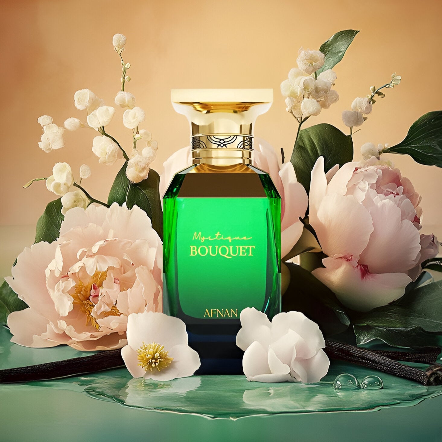 Afnan Mystique Bouquet EDP smells like a beautiful blend of fresh flowers like peony and orange blossom, combined with warm vanilla and musky notes, creating an enchanting and elegant scent perfect for any occasion.