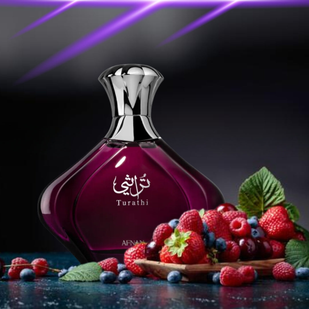 Afnan Turathi Purple EDP smells like a luxurious blend of sweet tangerine and blackcurrant, complemented by floral violet leaves and a rich heart of patchouli, vanilla, and amber, creating an elegant and confident fragrance perfect for modern women.