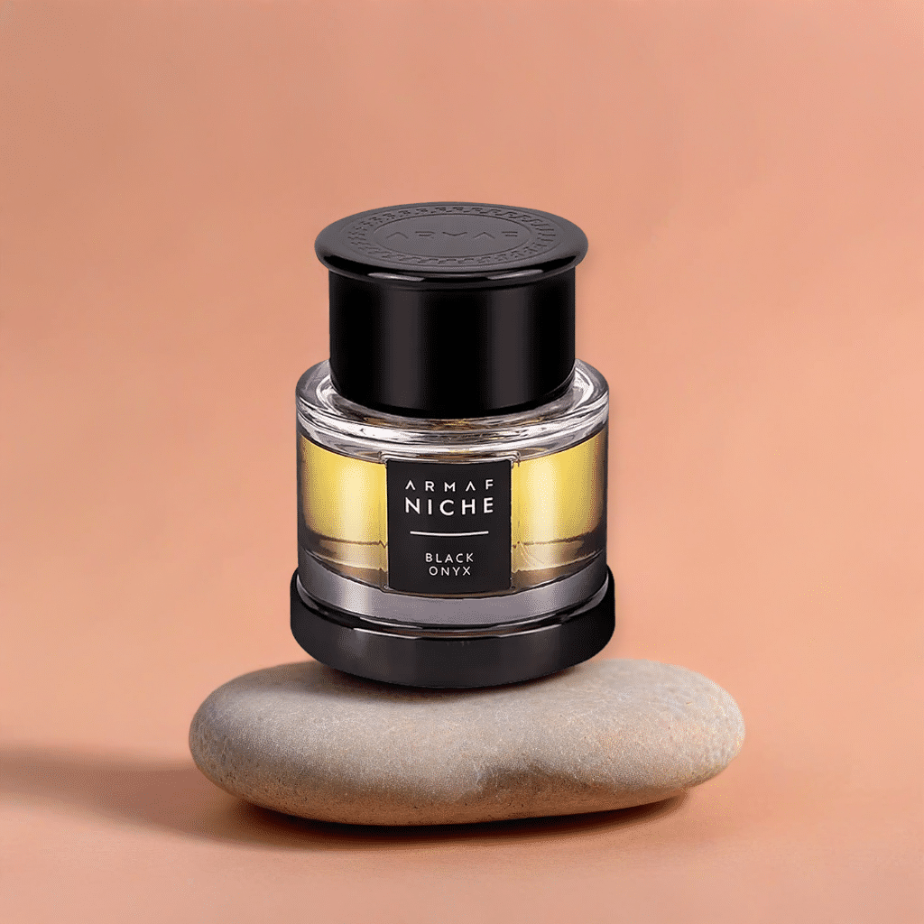 Armaf Niche Black Onyx EDP exudes a spicy, woody scent with a rich mix of cinnamon, cardamom, and oud, complemented by the luxurious notes of rose and myrrh.