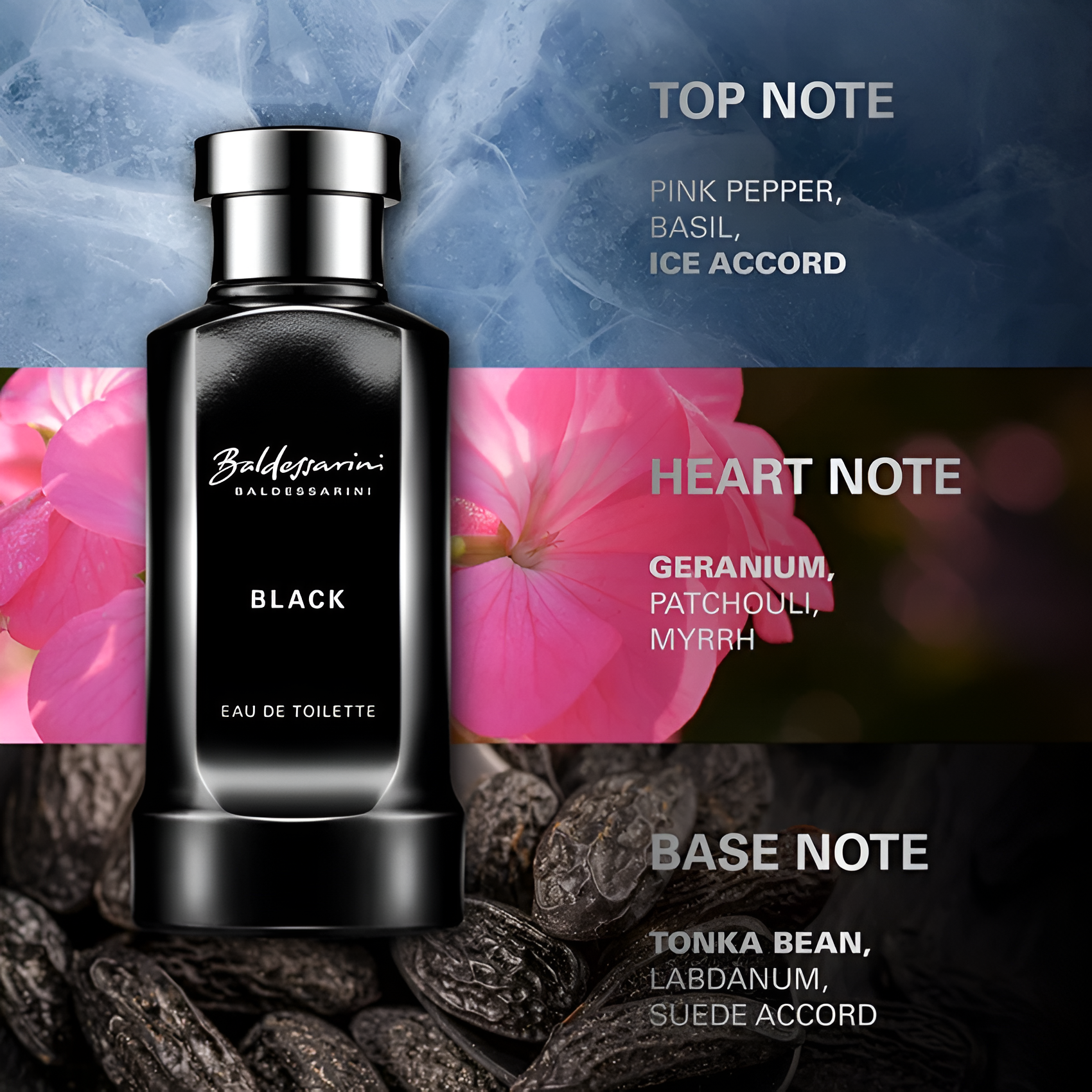 Baldessarini Black EDT smells like an amber woody blend with hints of basil, icy accents, and pink pepper.