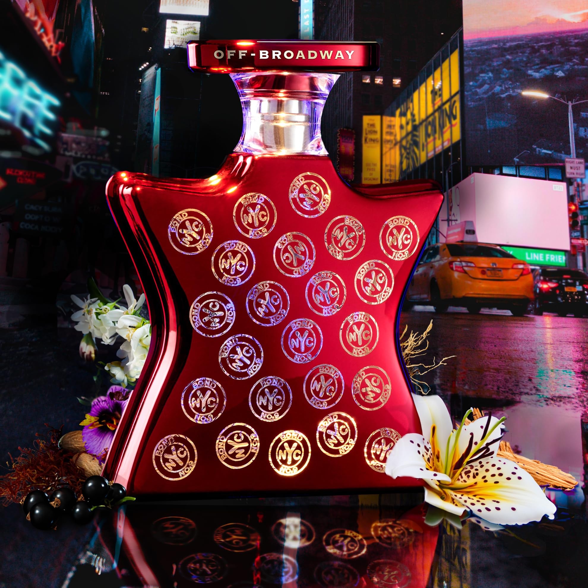 Bond No.9 Offbroadway EDP smells fresh and fruity with black currant and grapefruit at the top, blooming into floral notes of orange blossom and jasmine, and settling down with warm hints of cedarwood, vanilla, and amber.
