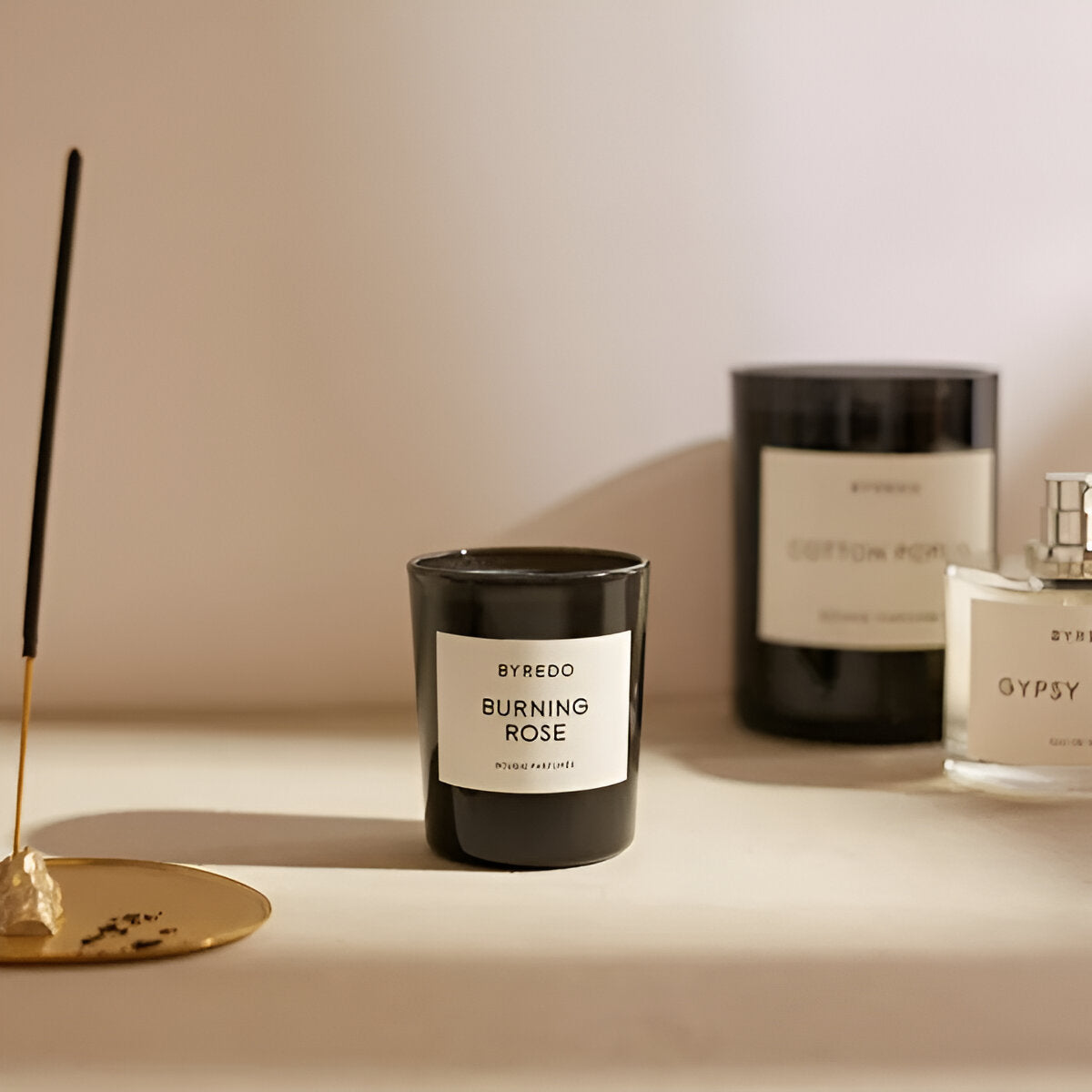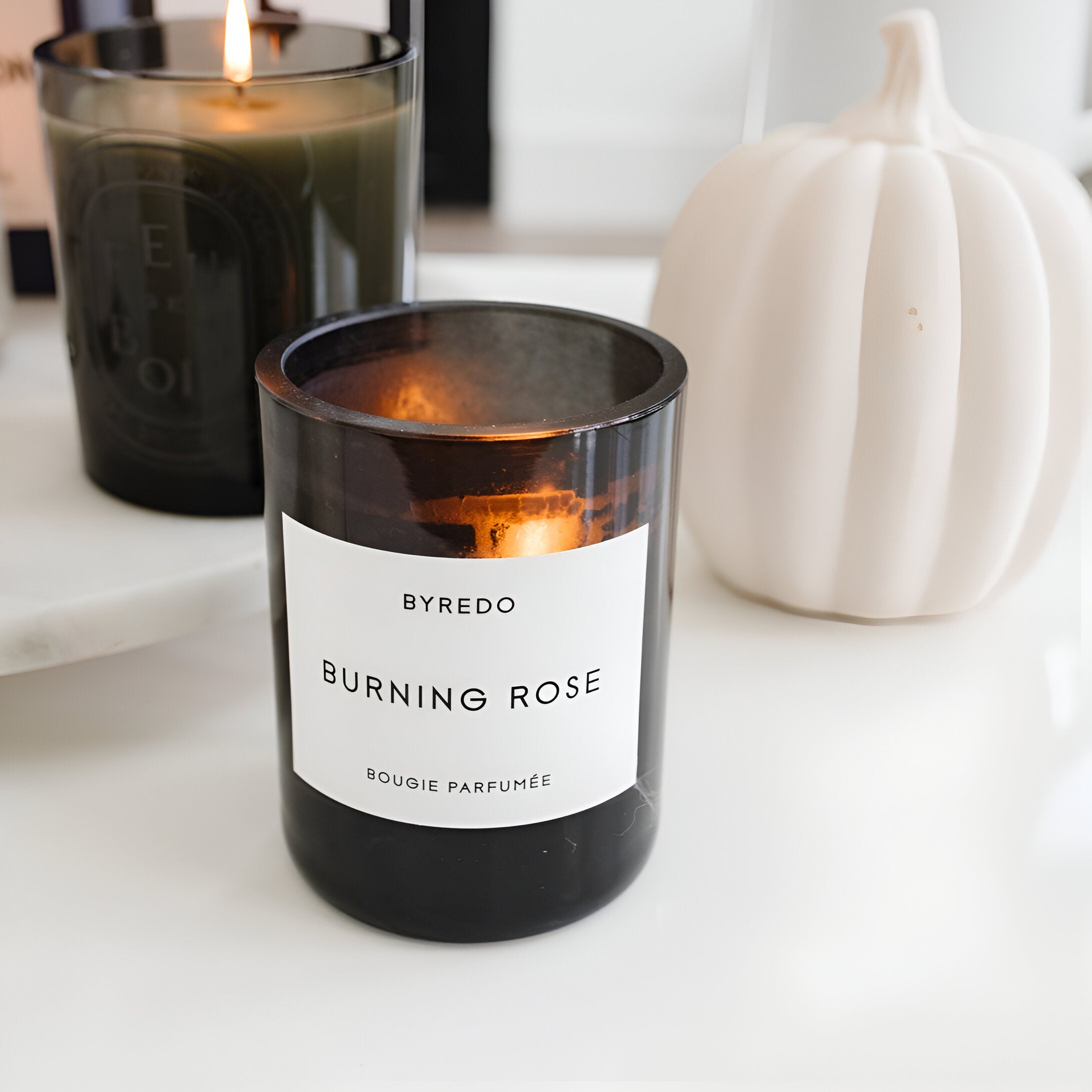 Ignite the essence of elegance with the Byredo Burning Rose Candle, where luxury meets the mysterious allure of a midnight garden.