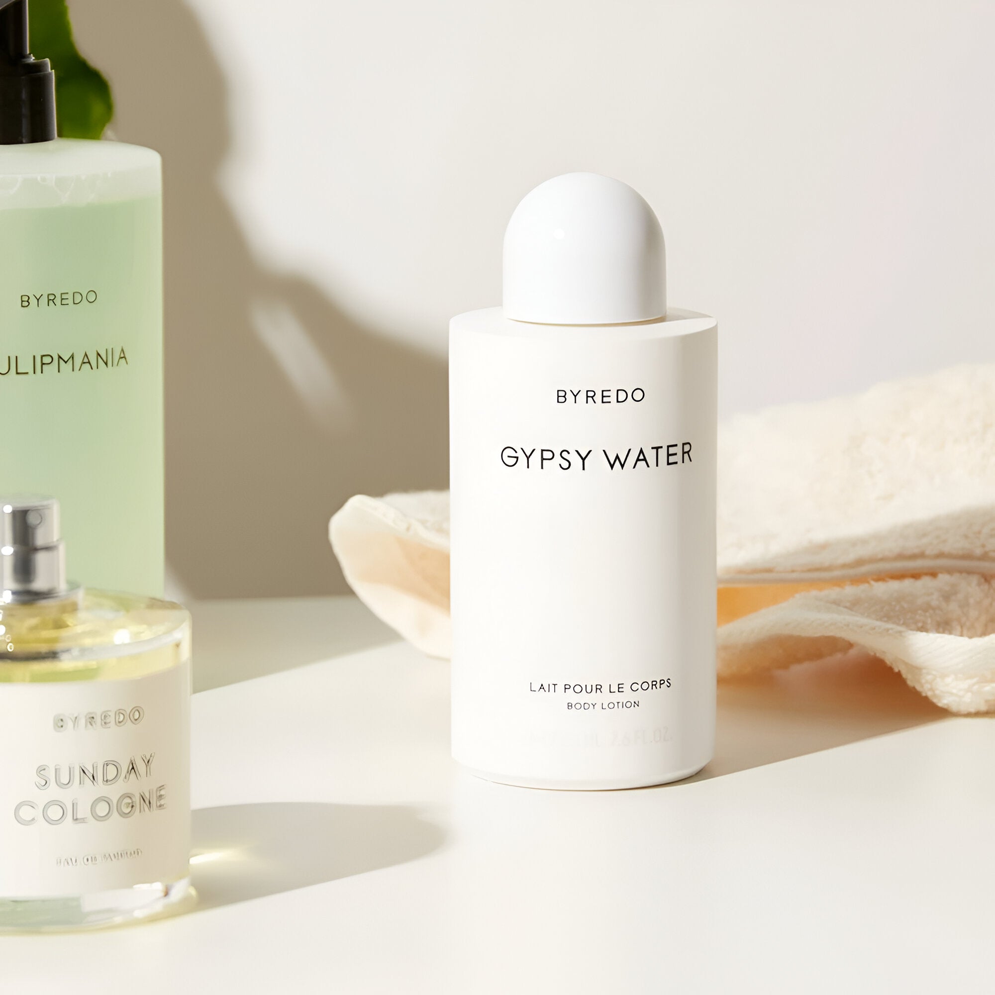 Byredo Gypsy Water Body Lotion envelops your skin in a silky, aromatic embrace of spring with its woody notes and hints of rhubarb and tulip.