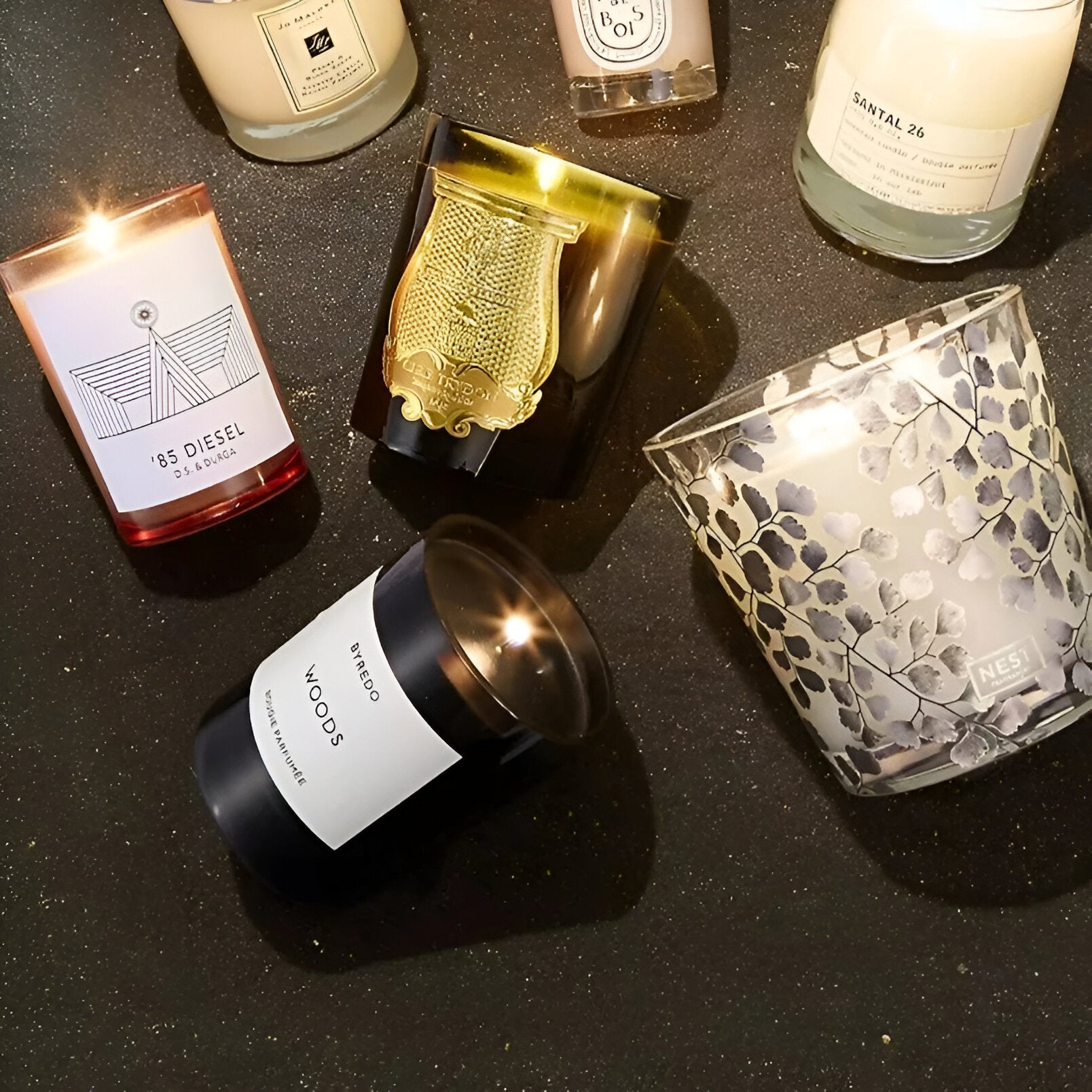 The Byredo Woods Candle offers a soothing blend of earthy woods, soft leather, and a hint of sweet vanilla, reminiscent of a tranquil stroll through a serene, mystical forest.