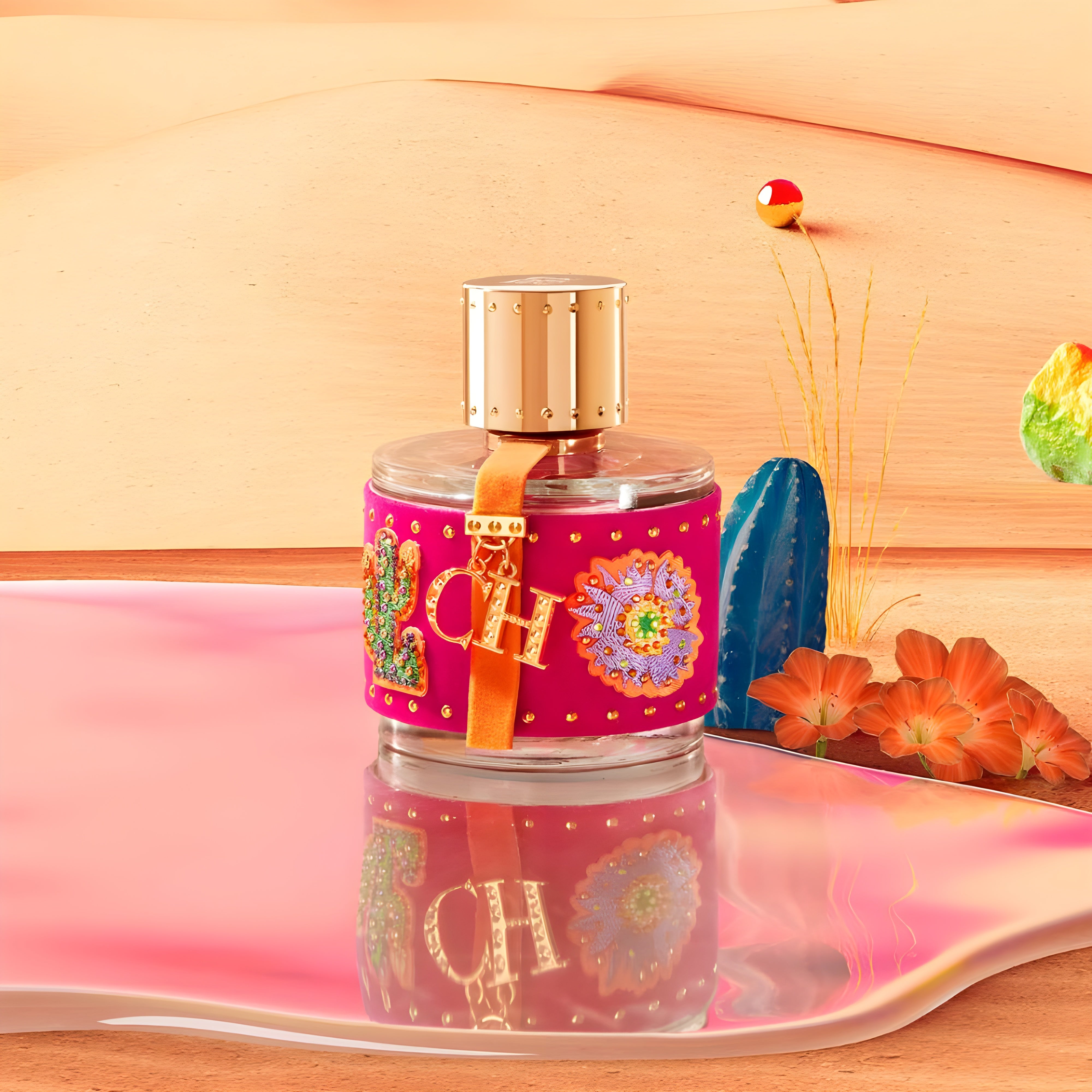 Experience the passionate merger of heat and love, encapsulated in the radiant essence of this fragrance. The uniquely crafted bottle mirrors the enchanting desert landscape, adorned with cactus blooms, making CH Hot! Hot! Hot! a collector's gem.