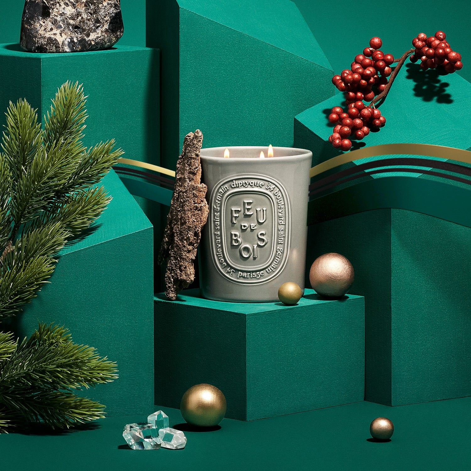 The Diptyque Feu De Bois Scented Candle smells like a warm, crackling wood fire.
