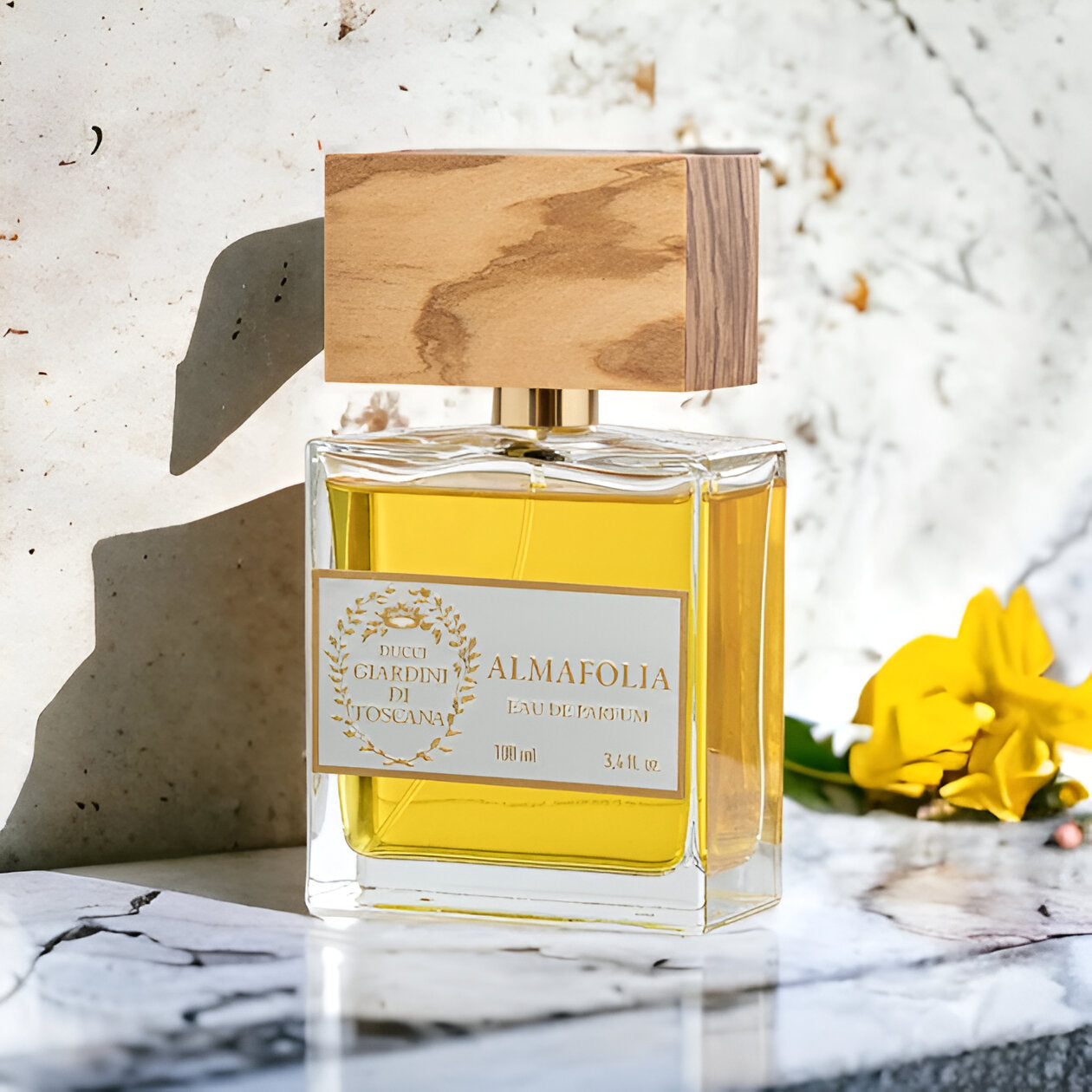 Giardini Di Toscana Almafolia EDP smells like a captivating blend of sweet orange and peach mixed with the enchanting floral scent of tuberose, all wrapped in a creamy, woodsy finish that evokes the beauty of Tuscan gardens.