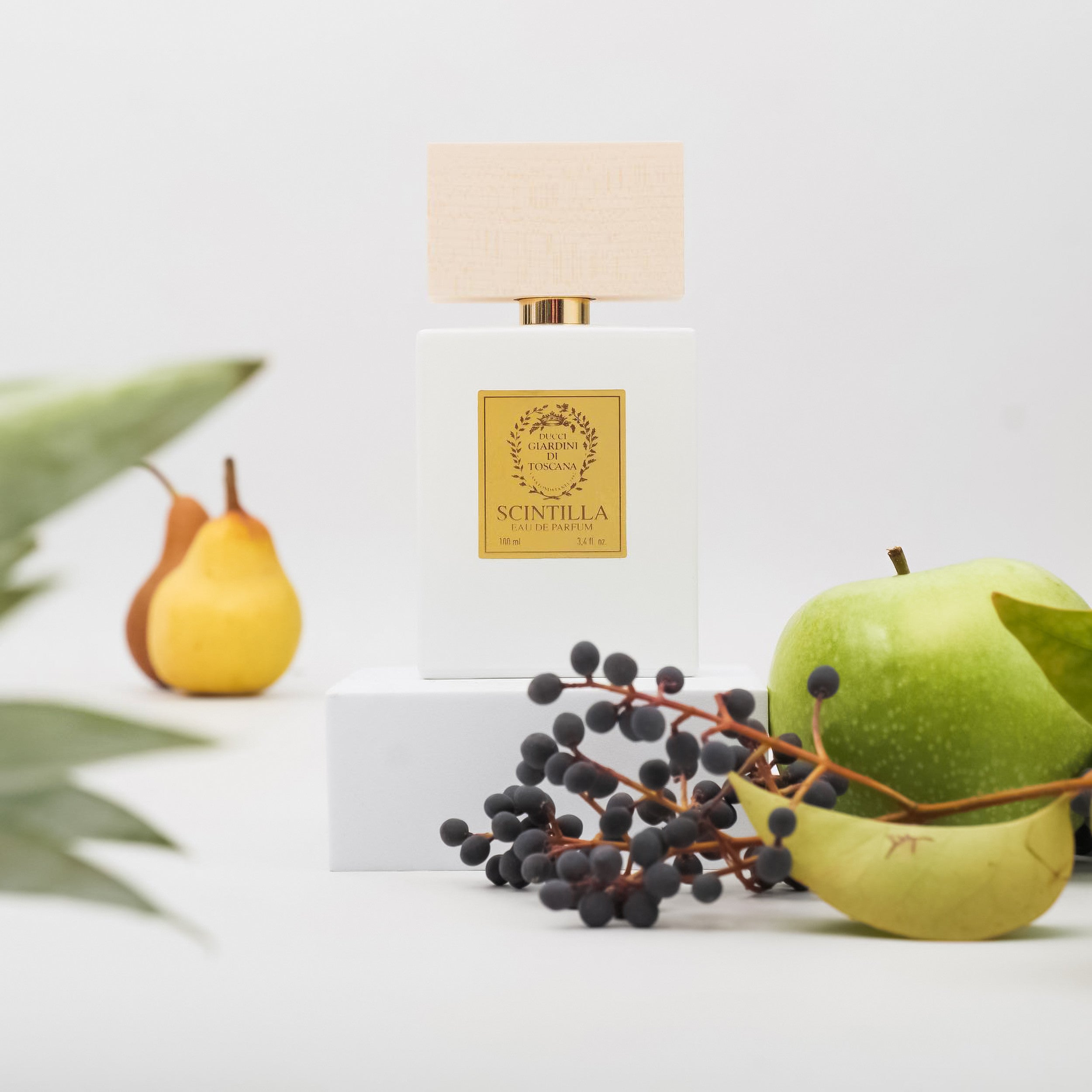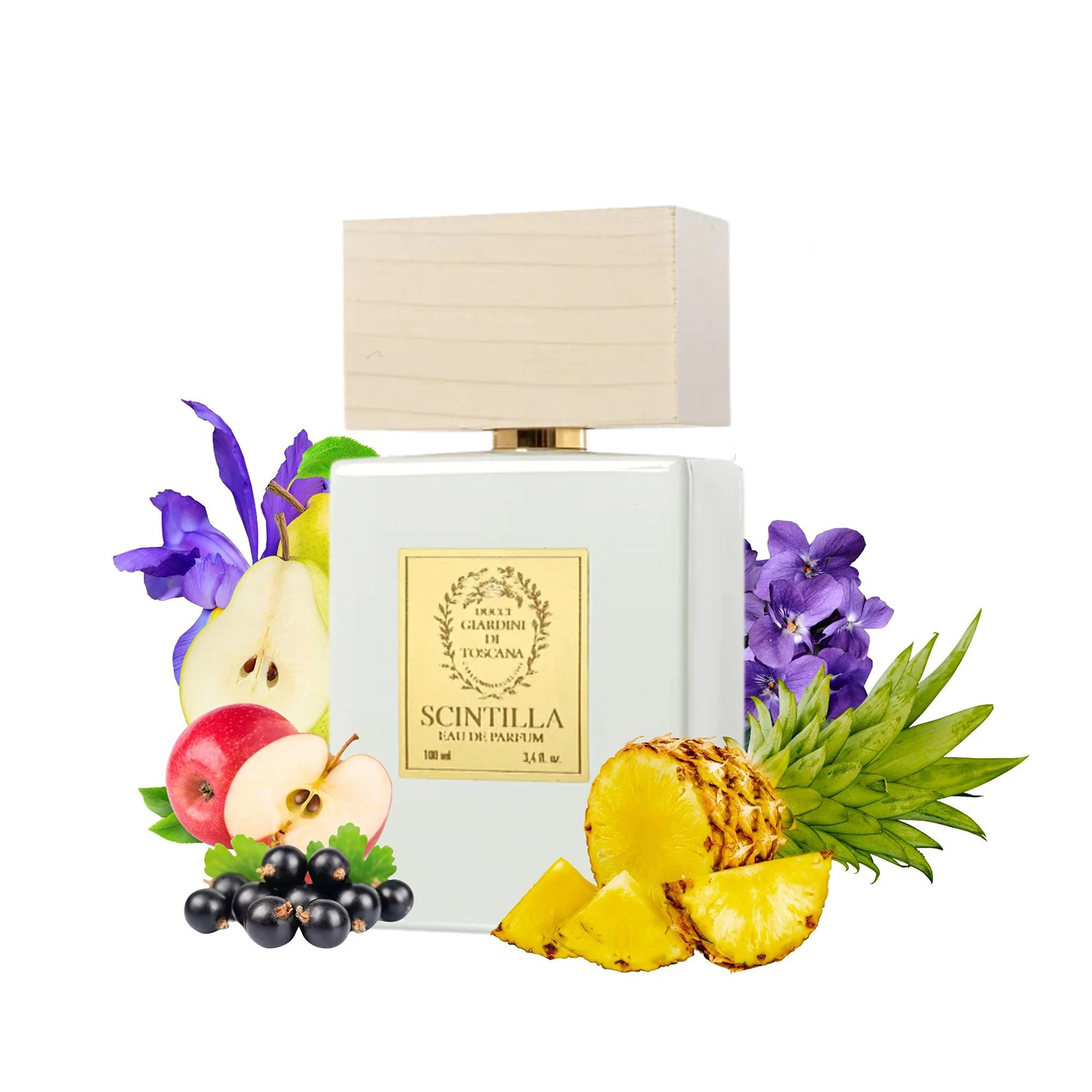 Giardini Di Toscana Scintilla EDP smells like a lively garden in Tuscany, combining refreshing citrus and spices with the soft elegance of iris, violet, and jasmine, all wrapped in a warm amber base.
