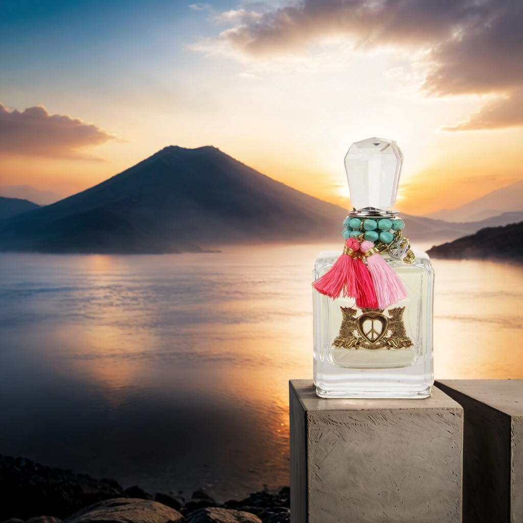 Juicy Couture Peace Love & Juicy Couture EDP smells like a fresh, joyful blend of flowers and fruits with earthy, bohemian vibes, inspired by the free-spirited essence of the 60s and 70s.