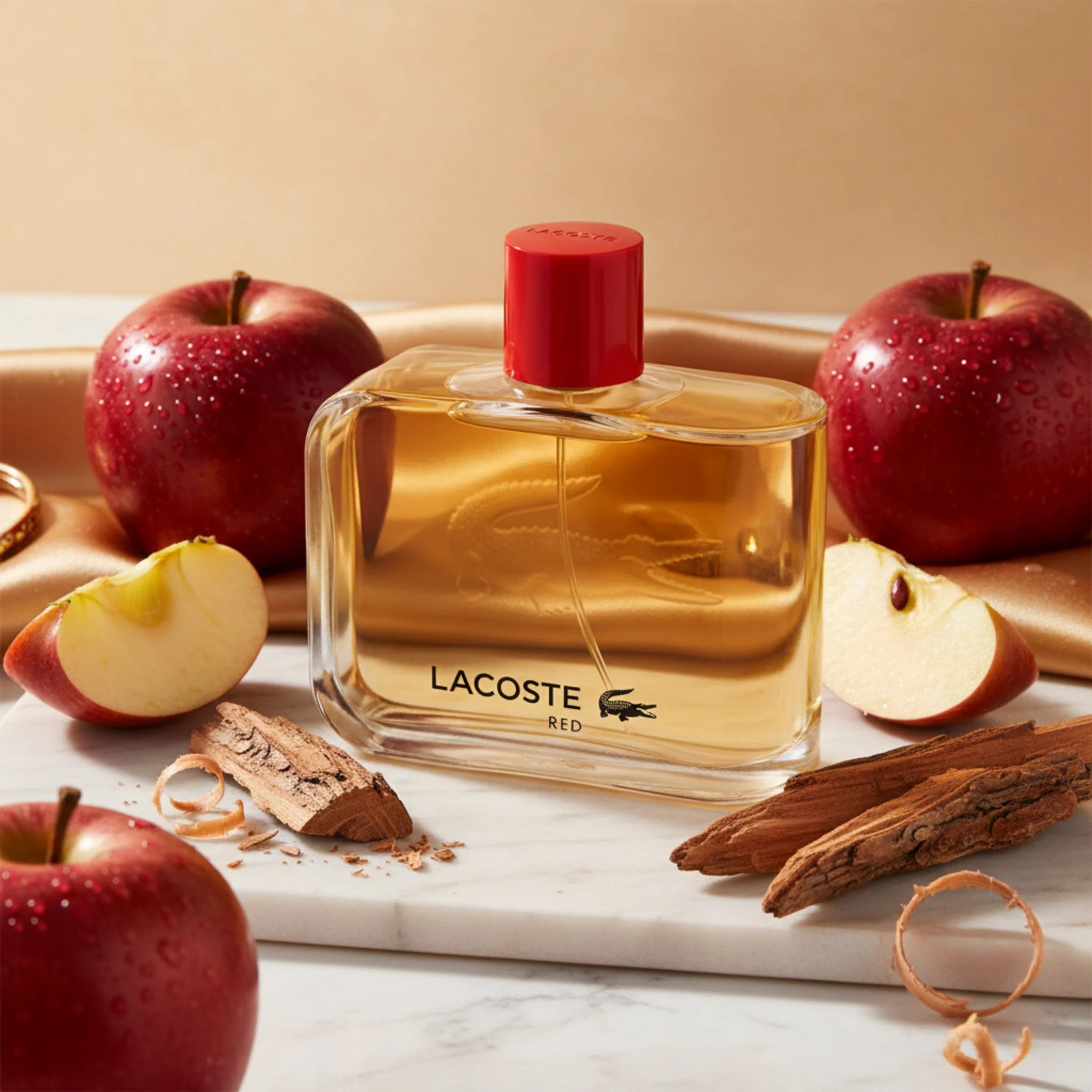 Lacoste Red EDT smells like energizing apple with rich, earthy patchouli undertones for a sophisticated, masculine scent.