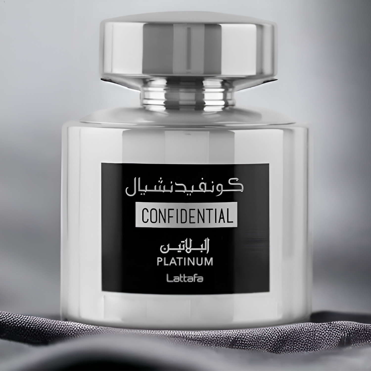 Lattafa Confidential Platinum EDP is a unisex fragrance with oud, musk, and citrus, blending tradition and modernity.