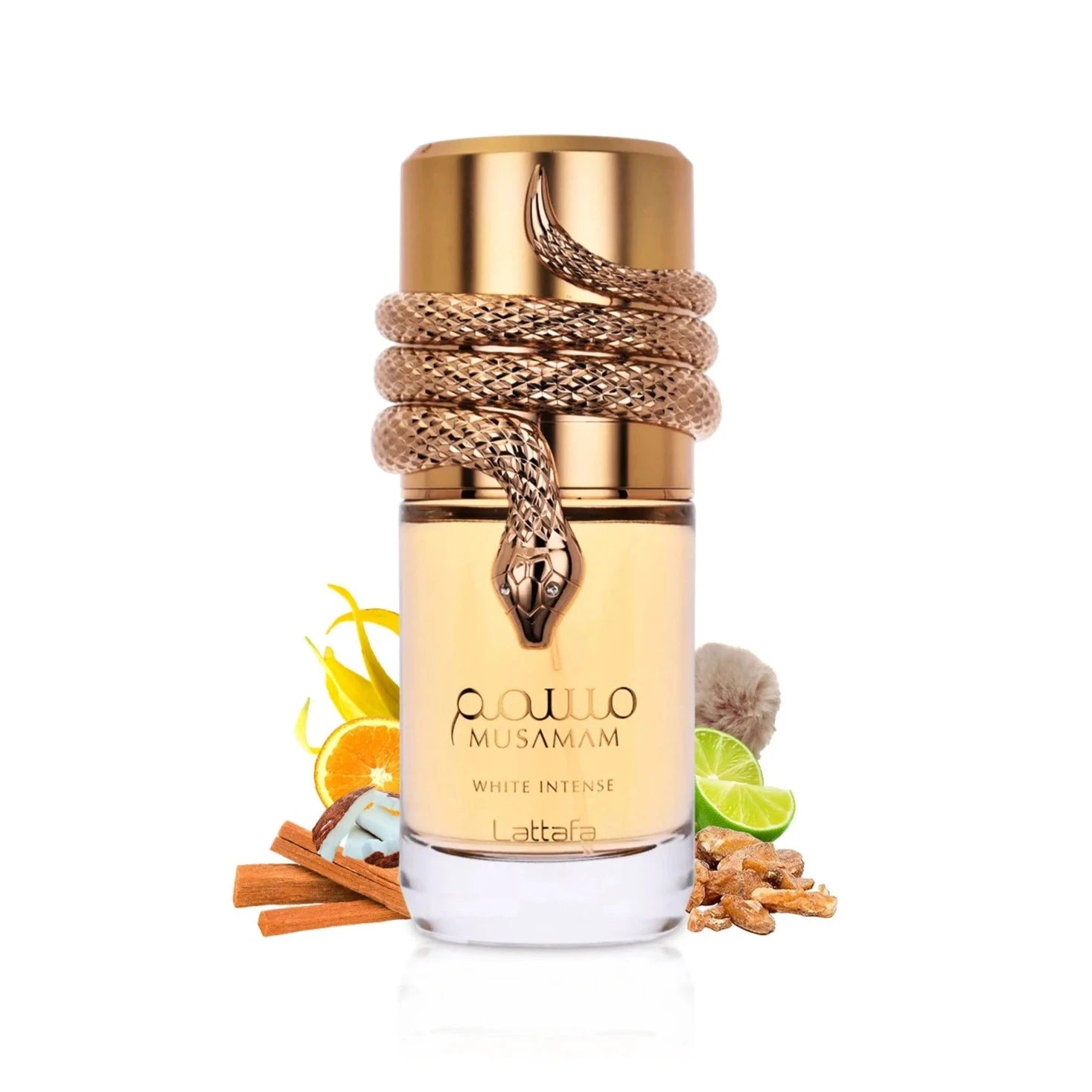 Experience modern luxury with Lattafa Musamam White Intense Eau de Parfum, a unisex fragrance blending amber, citrus, spices, musk, and wood.