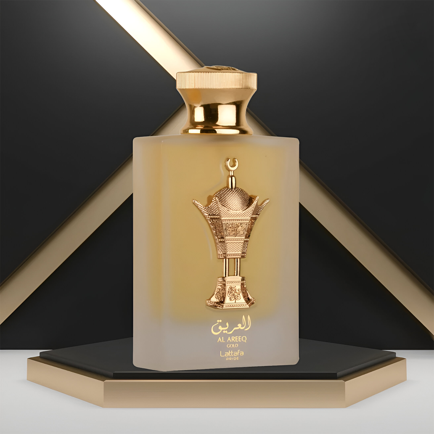 Experience Lattafa Pride Al Areeq Gold EDP: A luxurious blend of Ambra, Incense, & Leather, echoing the warmth & elegance of the Middle East.