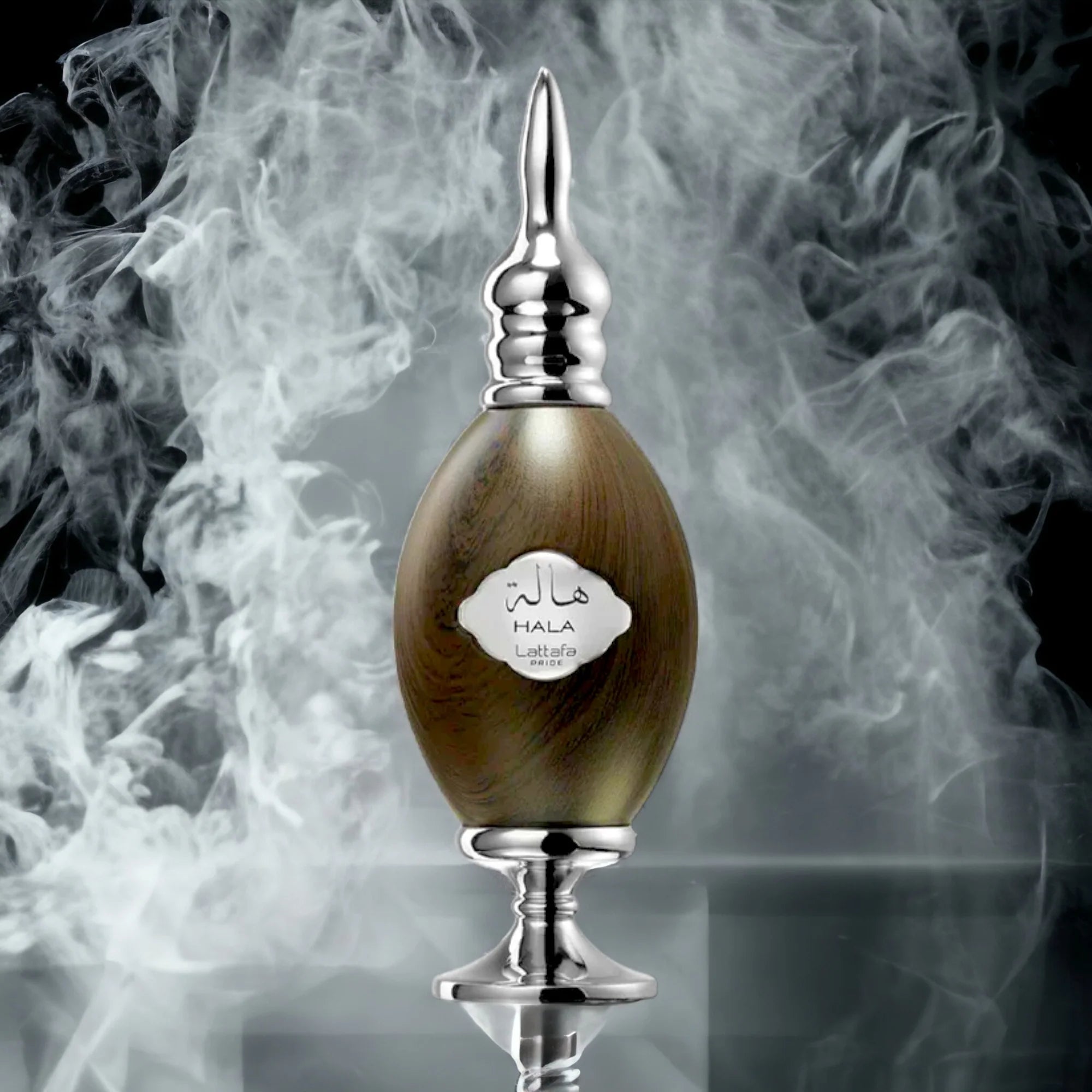 Lattafa Pride Hala EDP exudes a bold and luxurious aroma, starting with a spicy kick of pepper and nutmeg, leading into a warm heart of cedarwood and amber, and settling into a rich base of incense and labdanum.