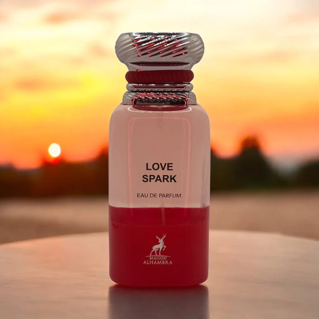 Maison Alhambra Love Spark EDP smells sweet and spicy with notes of cherry, ginger, and jasmine, creating a romantic and elegant scent perfect for anyone.