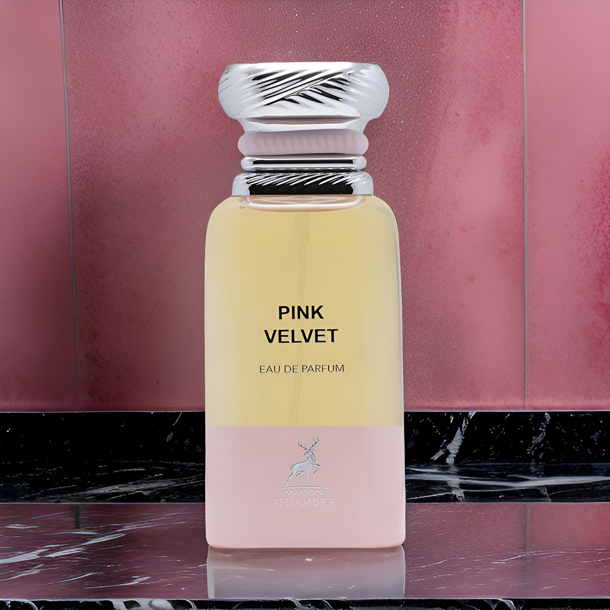 Maison Alhambra Pink Velvet EDP smells like a sweet and soft blend of floral and fruity notes, evoking a warm and cozy feeling with hints of delicate roses and creamy vanilla.