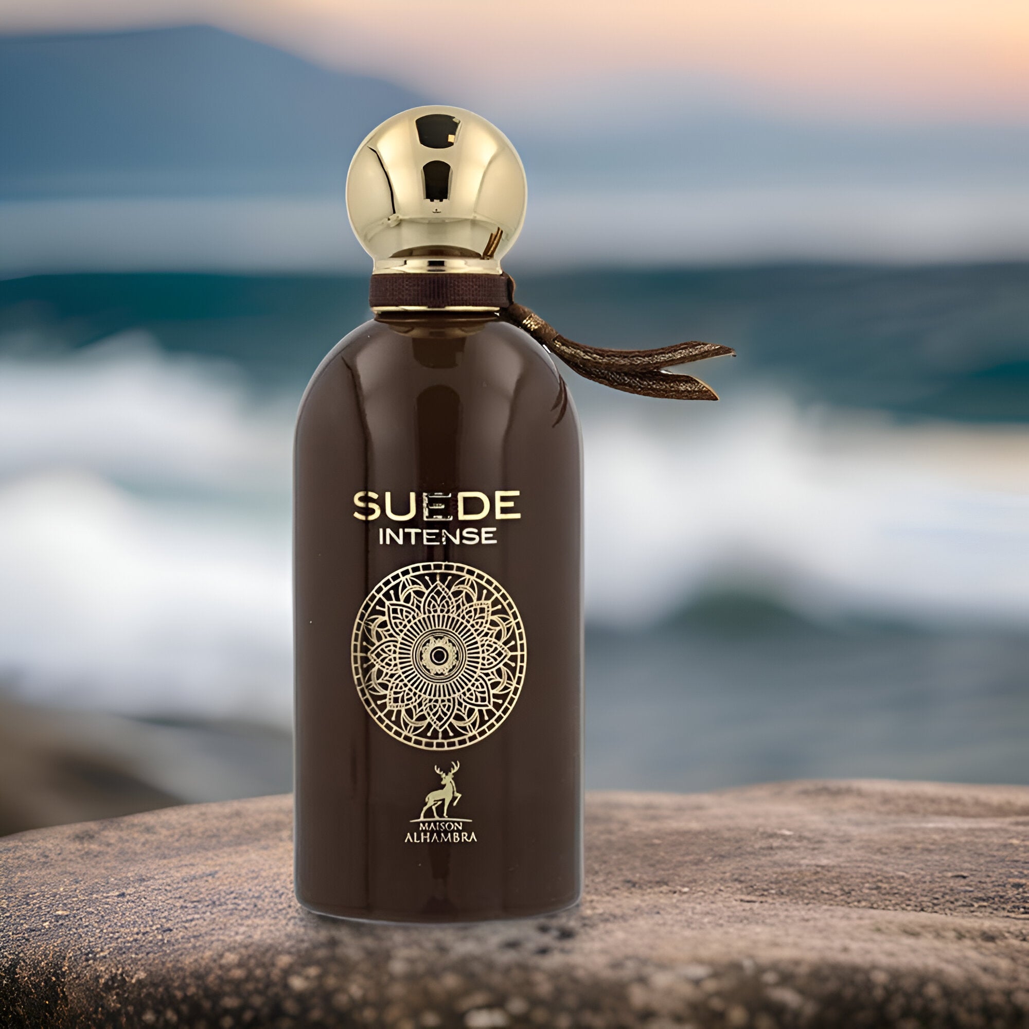 Maison Alhambra Suede Intense EDP smells like a luxurious blend of sweet honey and rich leather, wrapped in warm musk and amber, creating a captivating and sophisticated fragrance that feels both inviting and intense.