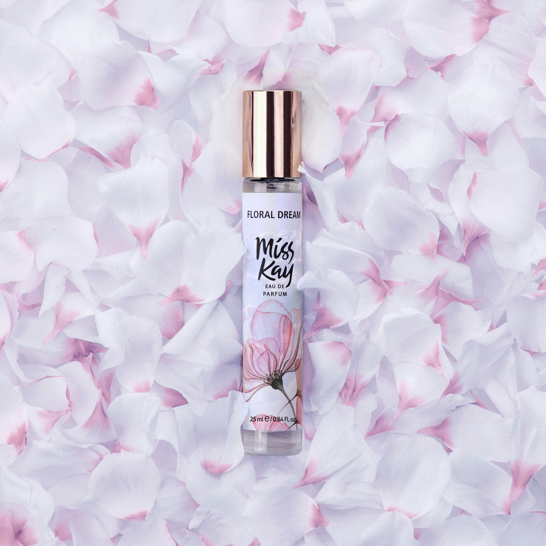 Miss Kay Floral Dream EDP smells like a delightful mix of sweet apples and red fruits, blooming water jasmine and lily-of-the-valley, all wrapped in warm woods and rich floral notes, evoking a carefree, sunny festival vibe.