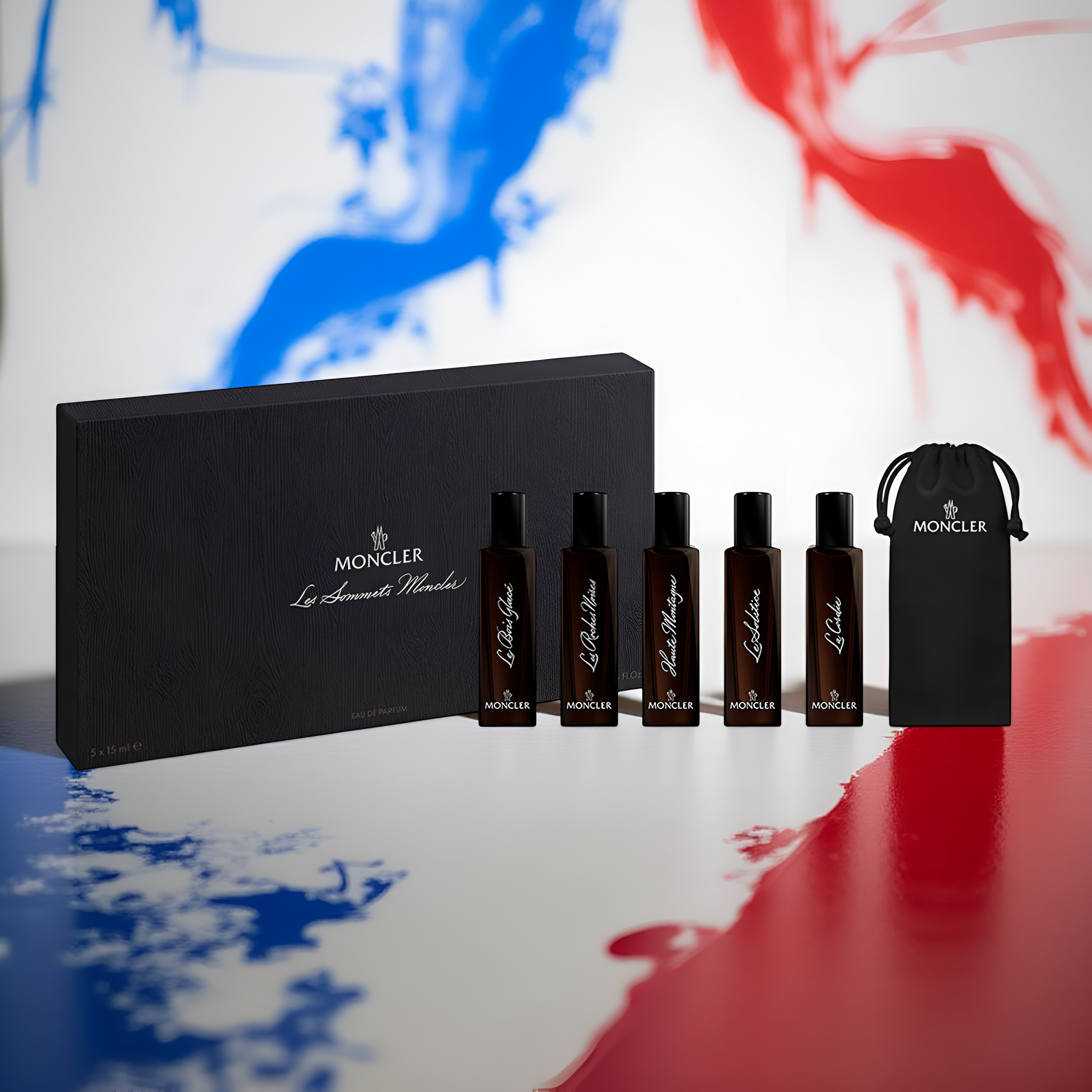 • What's inside: 15ml Moncler Le Bois EDP Travel Spray, 15ml Moncler Les Roches EDP Travel Spray, 15ml Moncler Haute Montagne EDP Travel Spray, 15ml Moncler Le Solstice EDP Travel Spray, 15ml Moncler La Cordee EDP Travel Spray, Travel Pouch