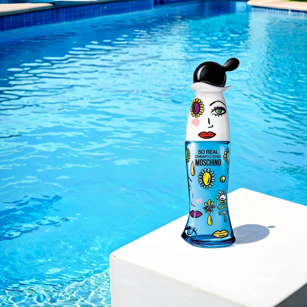 Moschino So Real Cheap & Chic EDT smells like a fun and whimsical blend of bright floral notes, woody undertones, and a playful essence inspired by Olive Oyl.