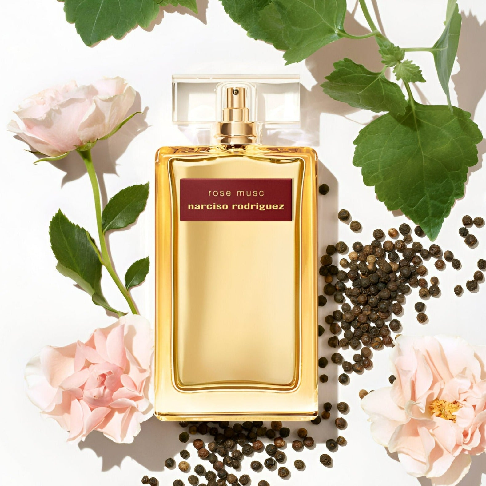 Narciso Rodriguez Rose Musc EDP Intense smells like a luxurious blend of rich roses, exotic spices, and deep woody notes, all centered around an intense, captivating musk heart.