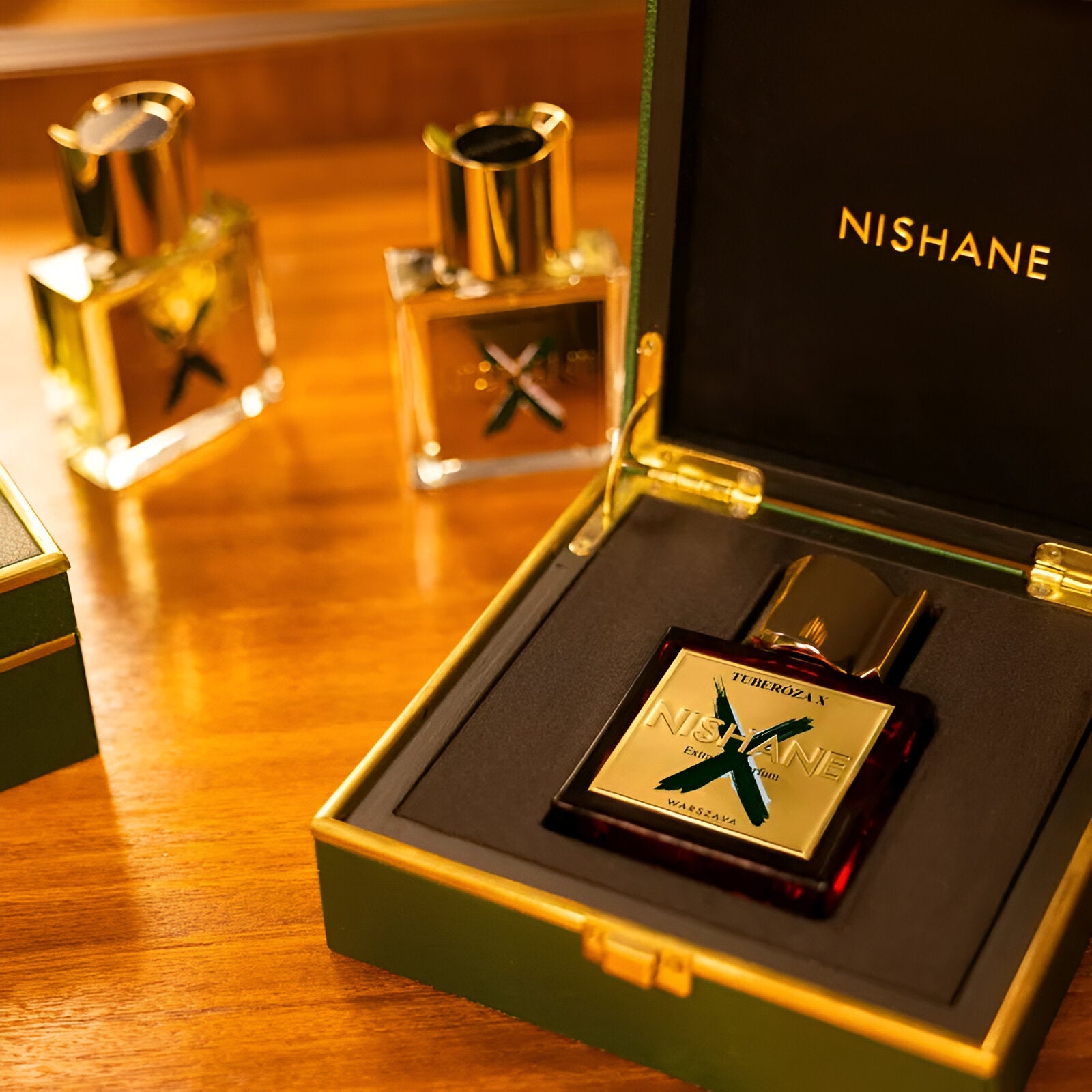 Nishane Tuberoza X Extrait De Parfum smells like a beautiful mix of sweet, floral tuberose and earthy vetiver, creating a unique scent that feels both enchanting and sophisticated.