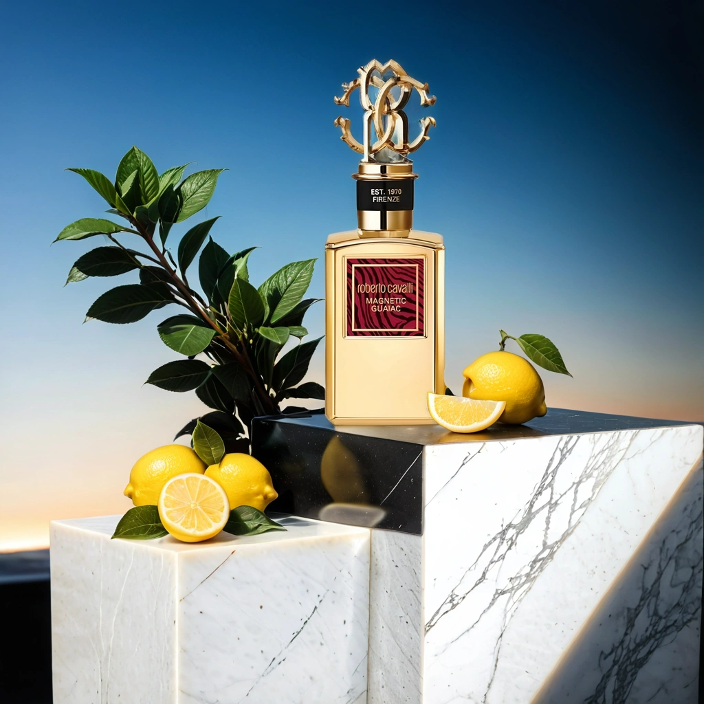 Roberto Cavalli Gold Collection Magnetic Guaiac Parfum smells like a sophisticated blend of dates, cognac, and olibanum, with rich undertones of black leather, guaiac wood, and rose, finishing with a soft, luxurious guaiac wood base.