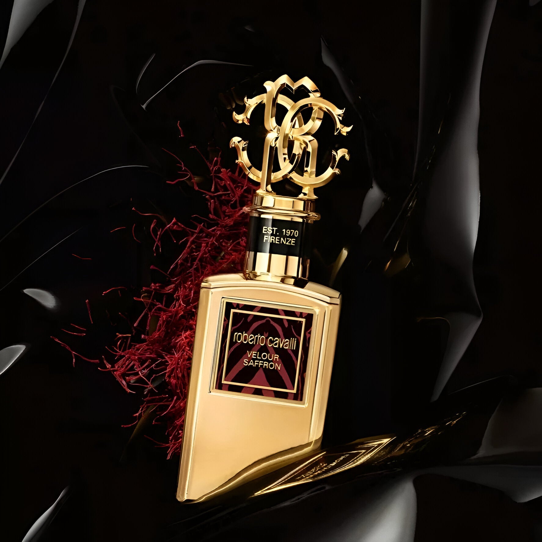 Roberto Cavalli Gold Collection Velour Saffron Parfum smells like a luxurious blend of rich saffron, wild incense, and hints of leather, myrrh, and black pepper, evoking a sense of elegance and boldness.