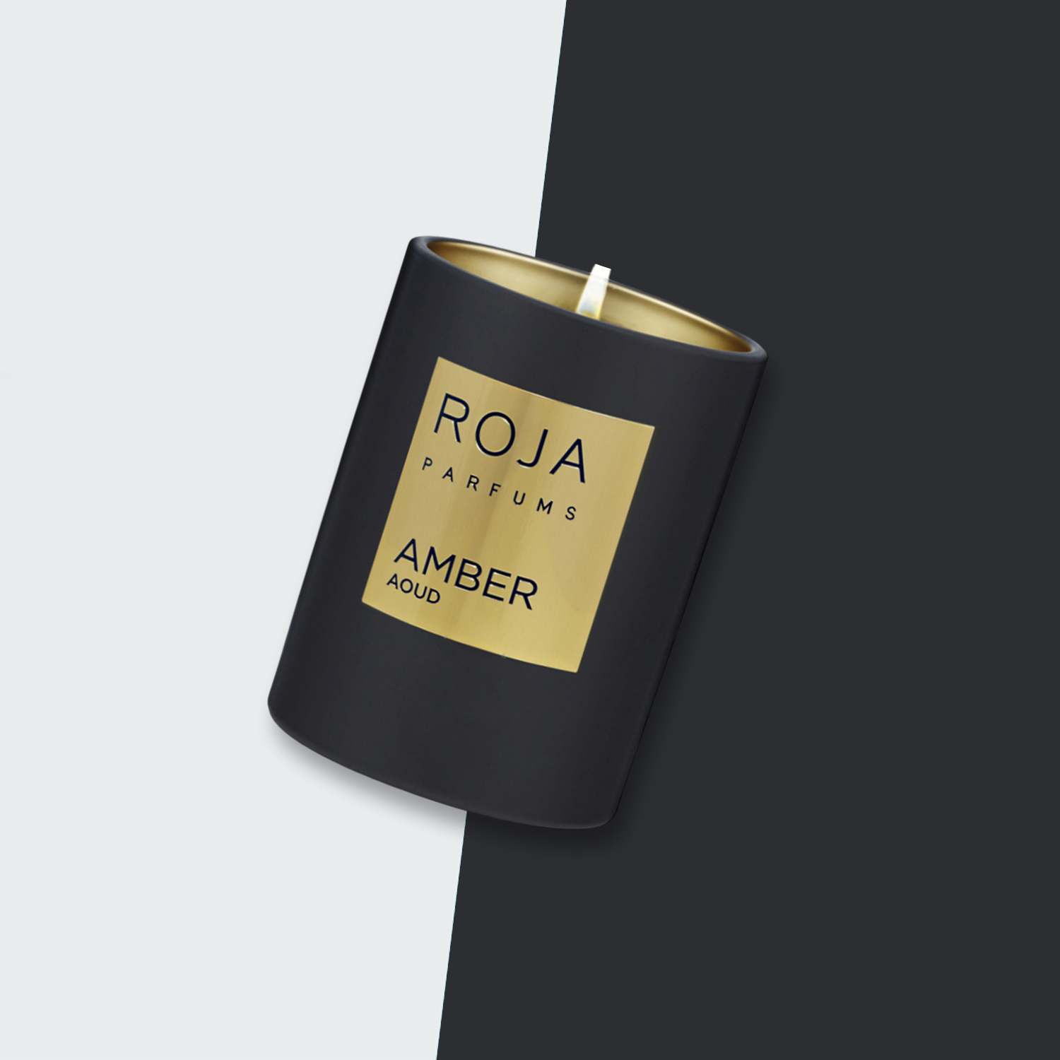 Roja Parfums Amber Aoud Candle has a warm and luxurious scent that combines rich amber and deep, exotic woods with a hint of sweetness, creating an inviting and opulent atmosphere.