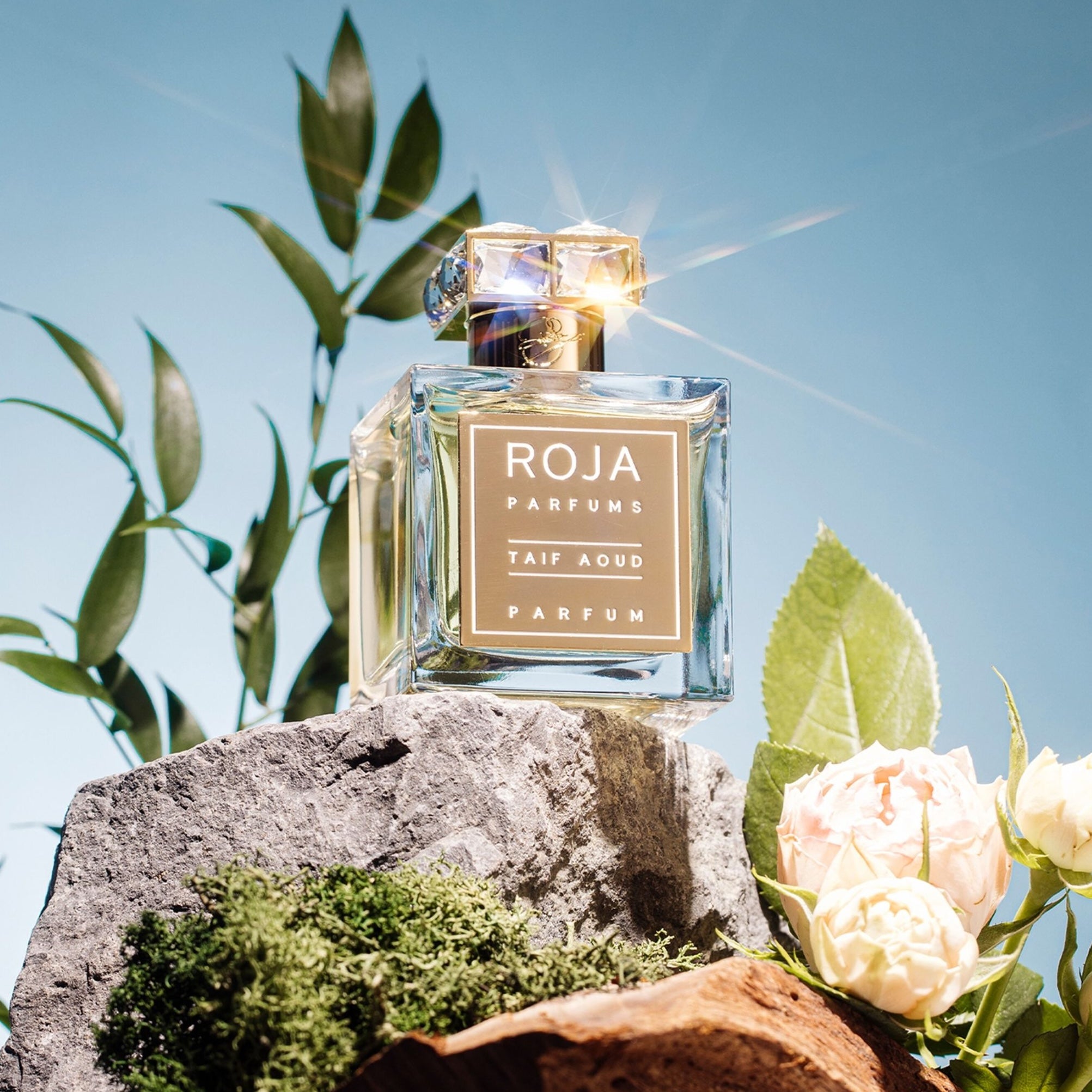 Roja Parfums Taif Aoud Parfum smells of warm spices, opulent amber, vetiver, with a citrus burst of bergamot, lime, and lemon, inspired by Taif's majesty.