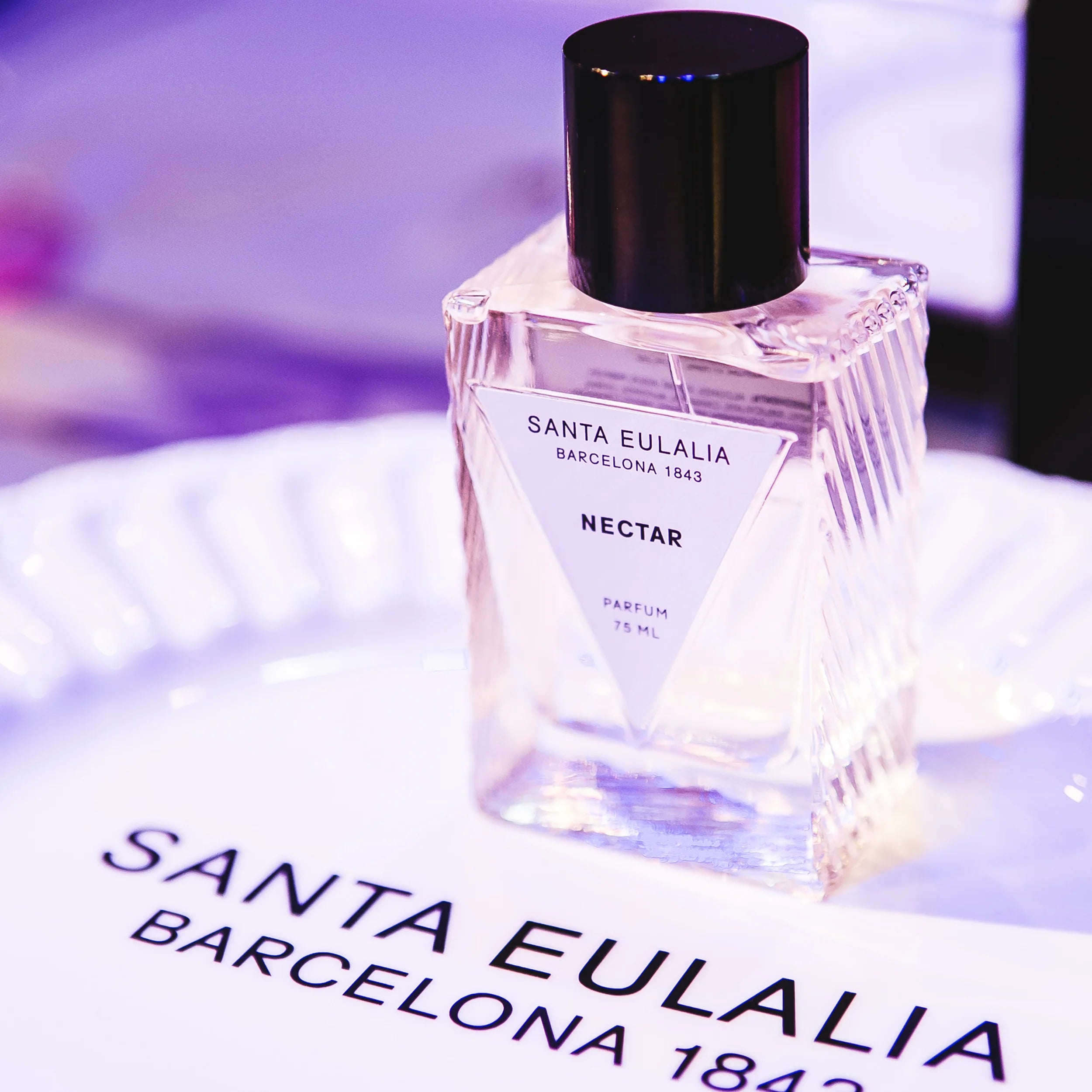 Santa Eulalia Nectar Parfum smells like a tropical beach escape, starting with a burst of juicy peaches, evolving into creamy sandalwood, and finishing with a hint of sweet vanilla.