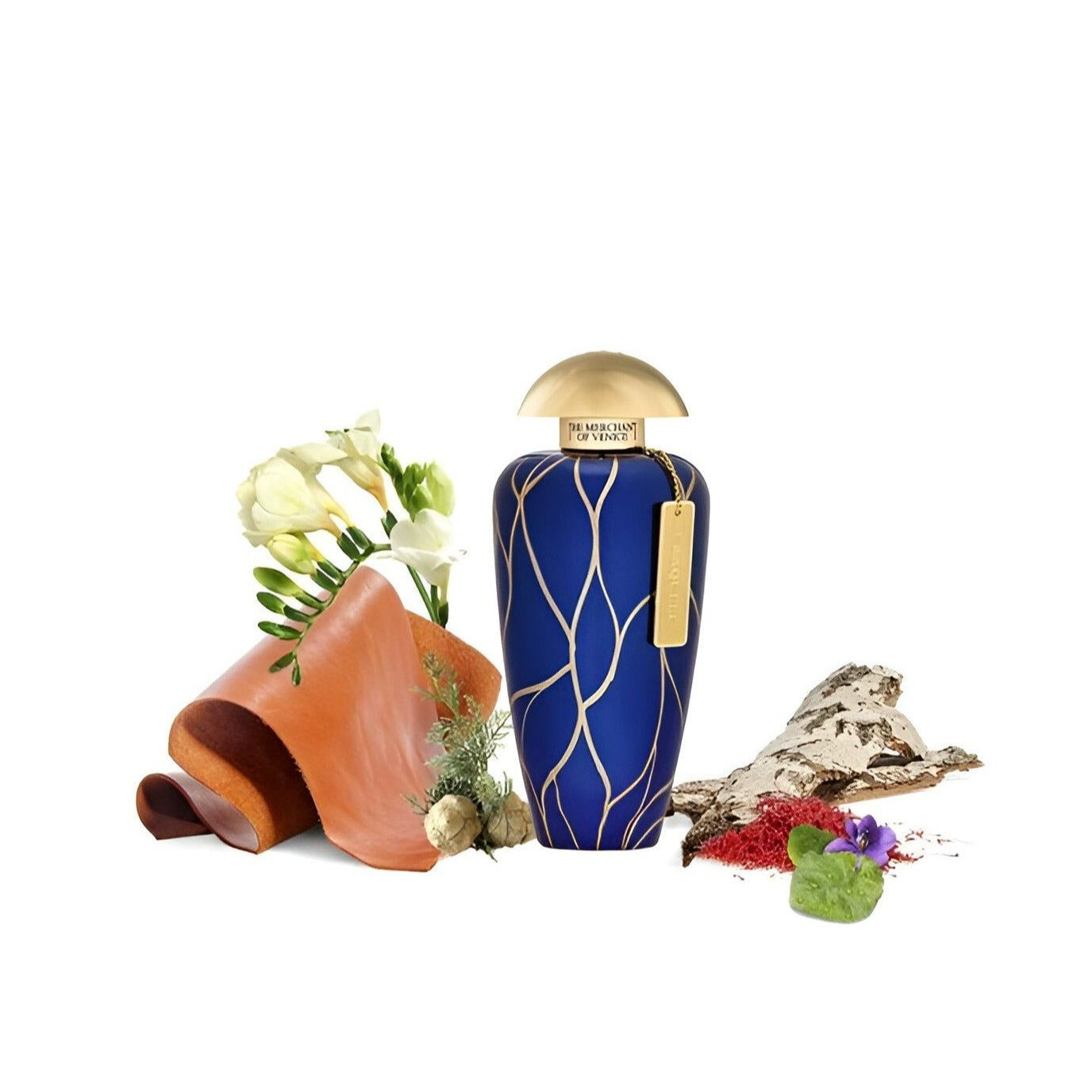 The Merchant Of Venice Craquele EDP exudes a luxurious scent inspired by the opulence of Venetian blue and gold, encapsulated in an elegant Murano glass bottle that reflects the grandeur of Venice's Ca' d'oro Palace.