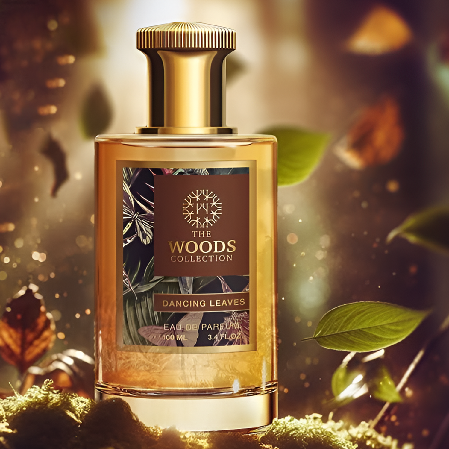 The Woods Collection Dancing Leaves EDP smells like a refreshing spring breeze in a forest, blending rosy scents with warm sandalwood and earthy patchouli for a natural and elegant experience.