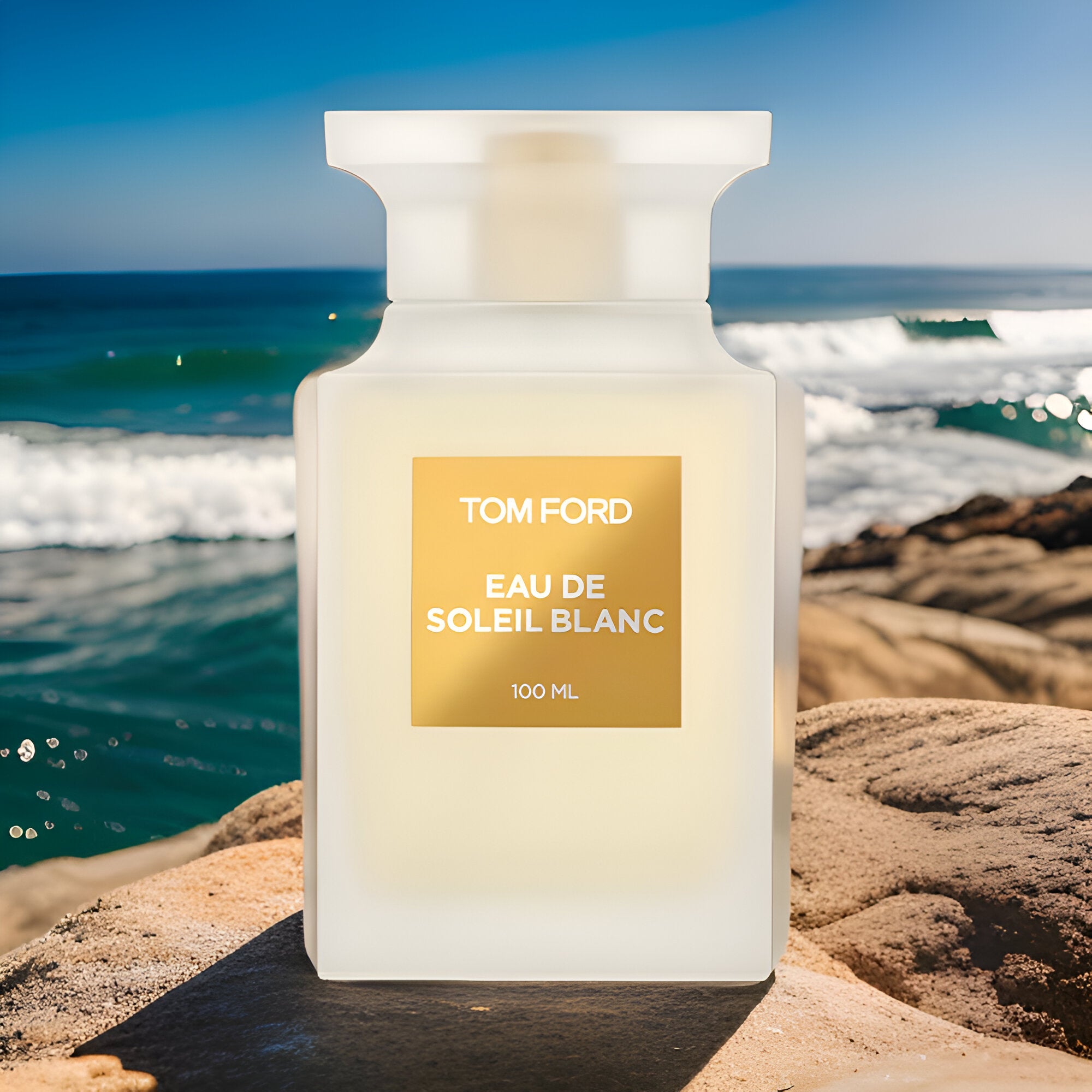 Tom Ford Eau De Soleil Blanc EDT smells like a bright and sunny blend of fresh citrus, warm coconut, and delicate floral notes, evoking a luxurious beach getaway.