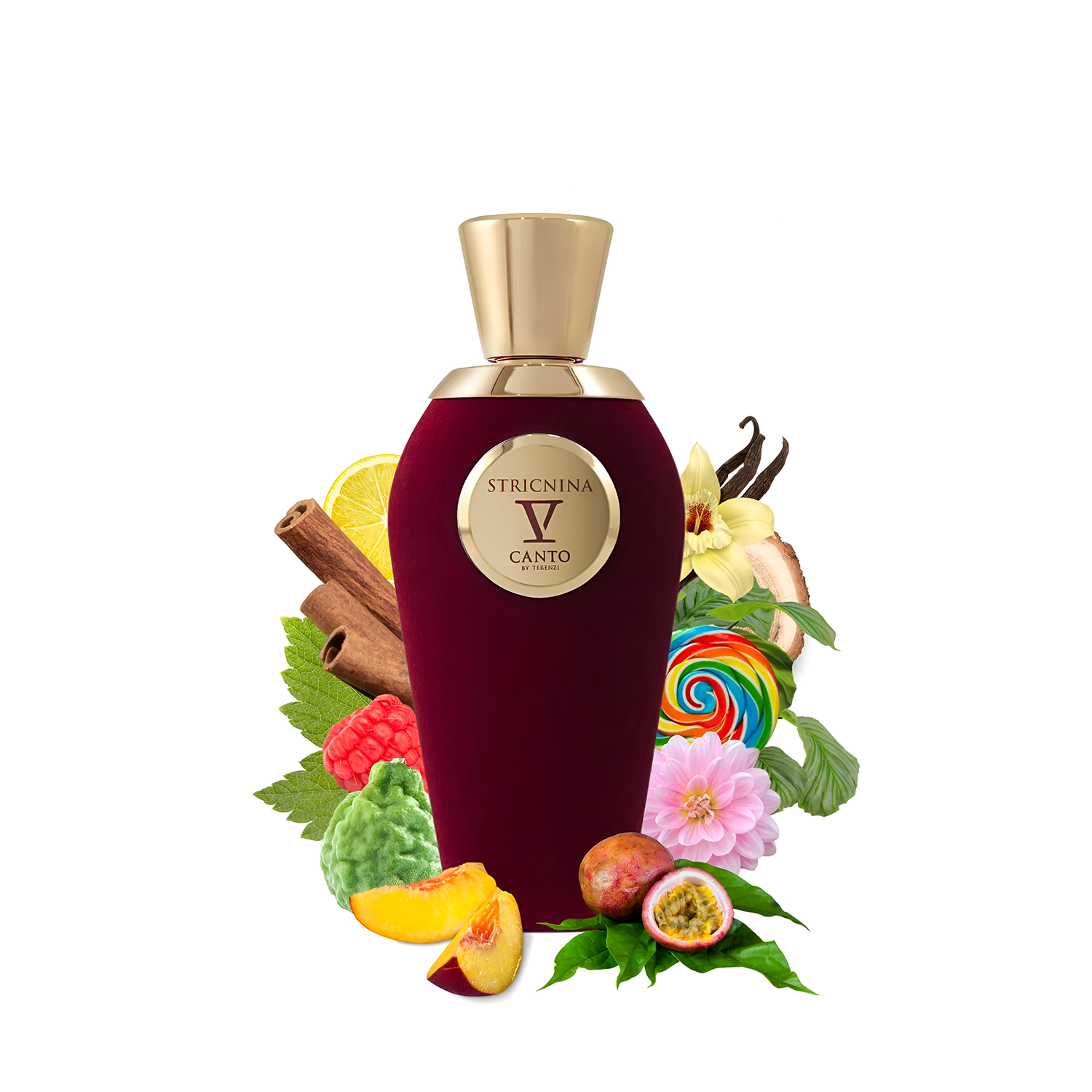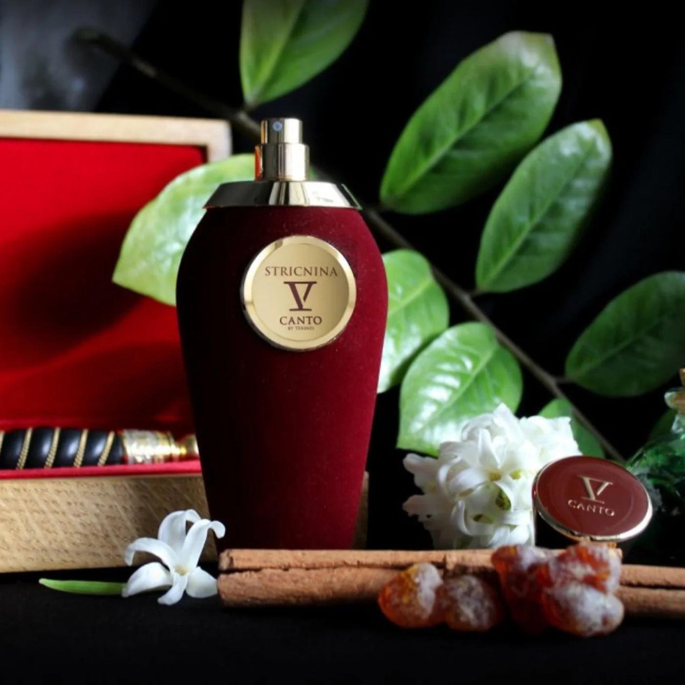 V Canto Stricnina Extrait De Parfum has a rich, captivating scent with notes of sweet fruits, warm spices, and a hint of floral elegance, creating an alluring and unforgettable fragrance experience.