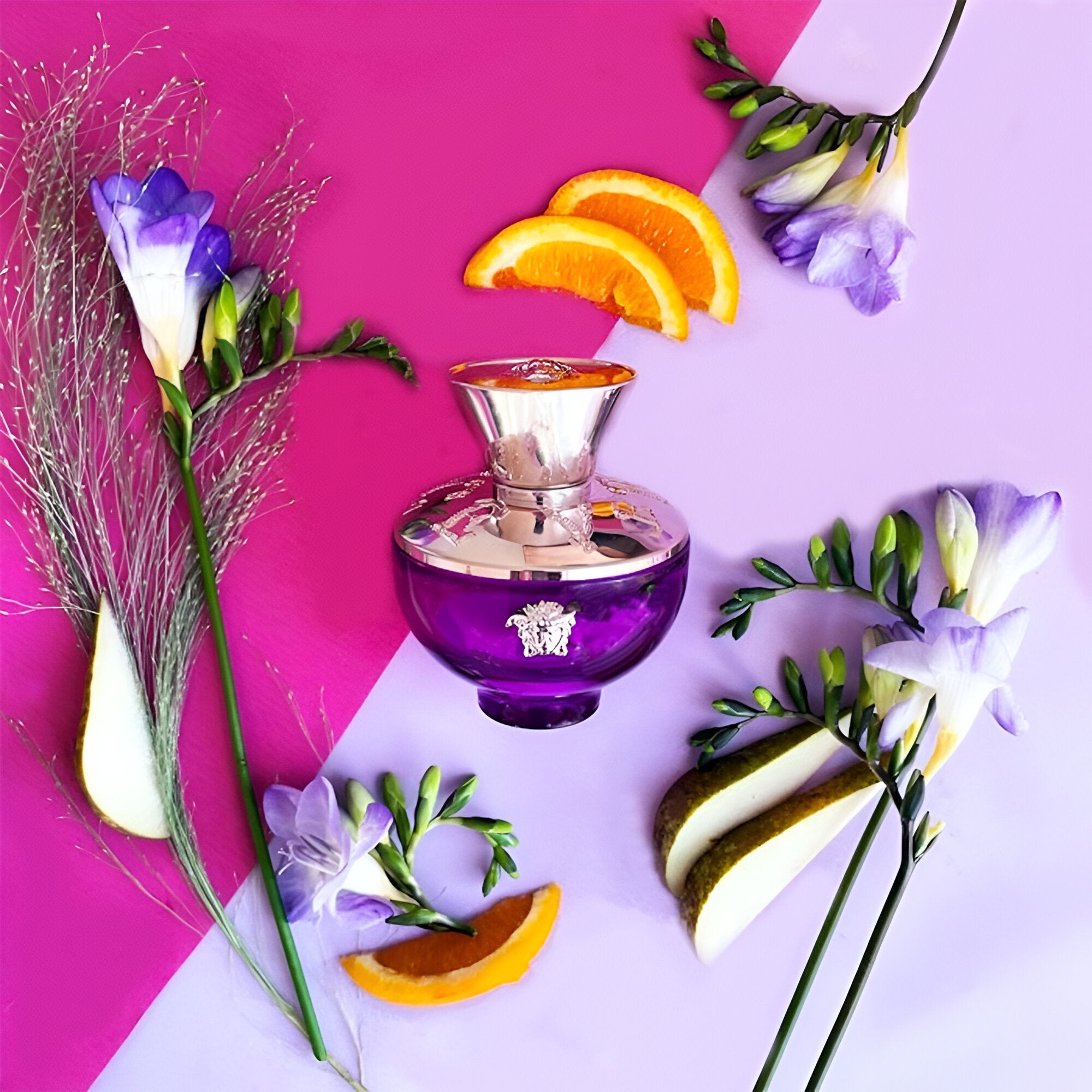 Versace Pour Femme Dylan Purple EDP smells like a vibrant and elegant blend of fresh, juicy pear, zesty bitter orange, and aromatic bergamot, capturing the magic of a sunset by the water.