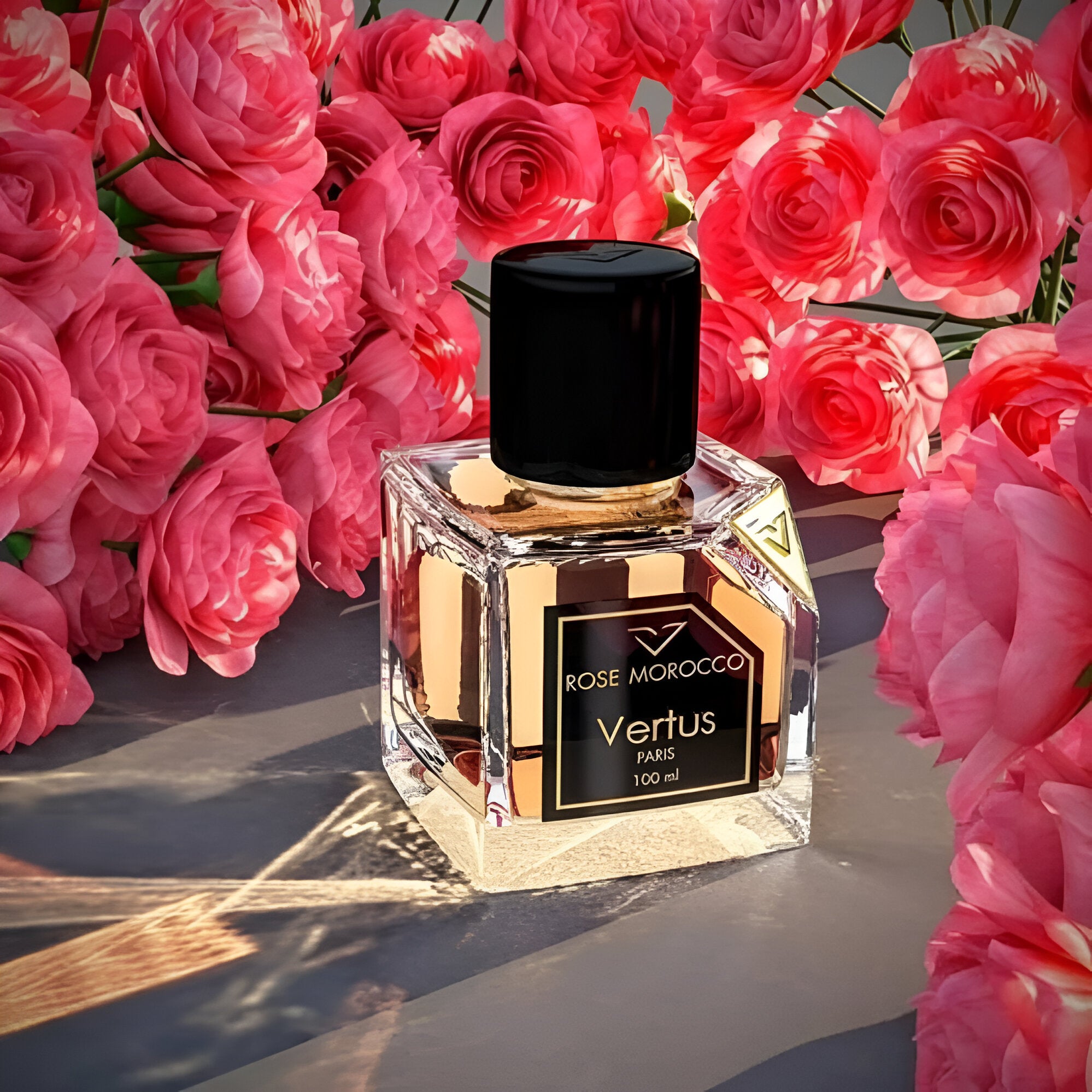 Vertus Rose Morocco EDP smells like a luxurious blend of rich rose damascena, woody sandalwood, and the enchanting essence of nature.