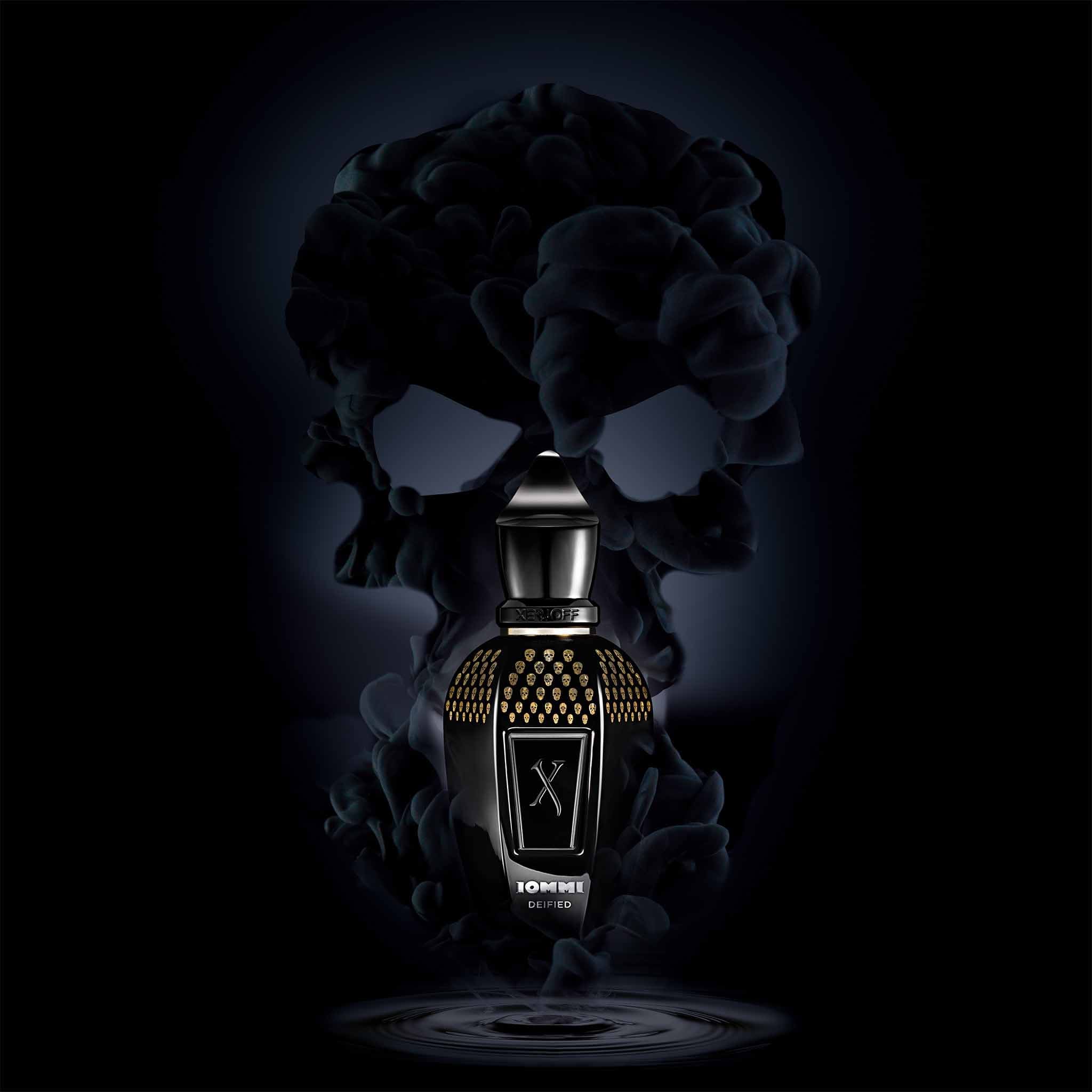 Xerjoff Tony Iommi Deified Parfum smells rich and smoky, blending dark notes of leather and spices with a hint of sweet, warm woods, creating a bold and captivating fragrance.